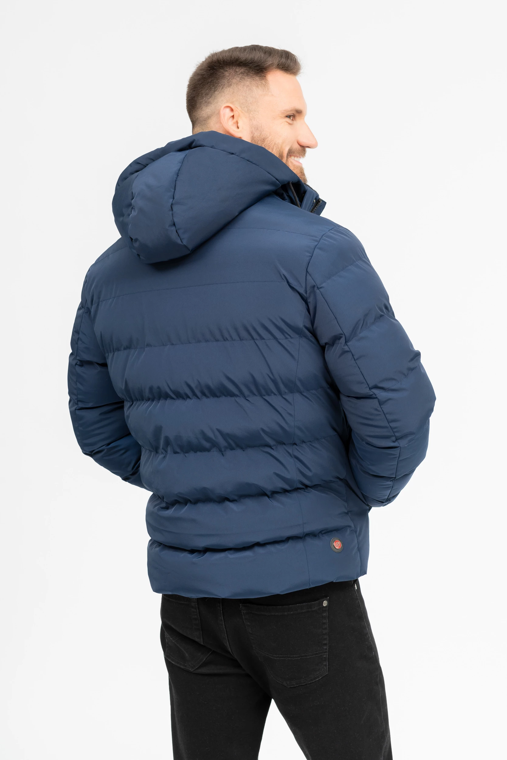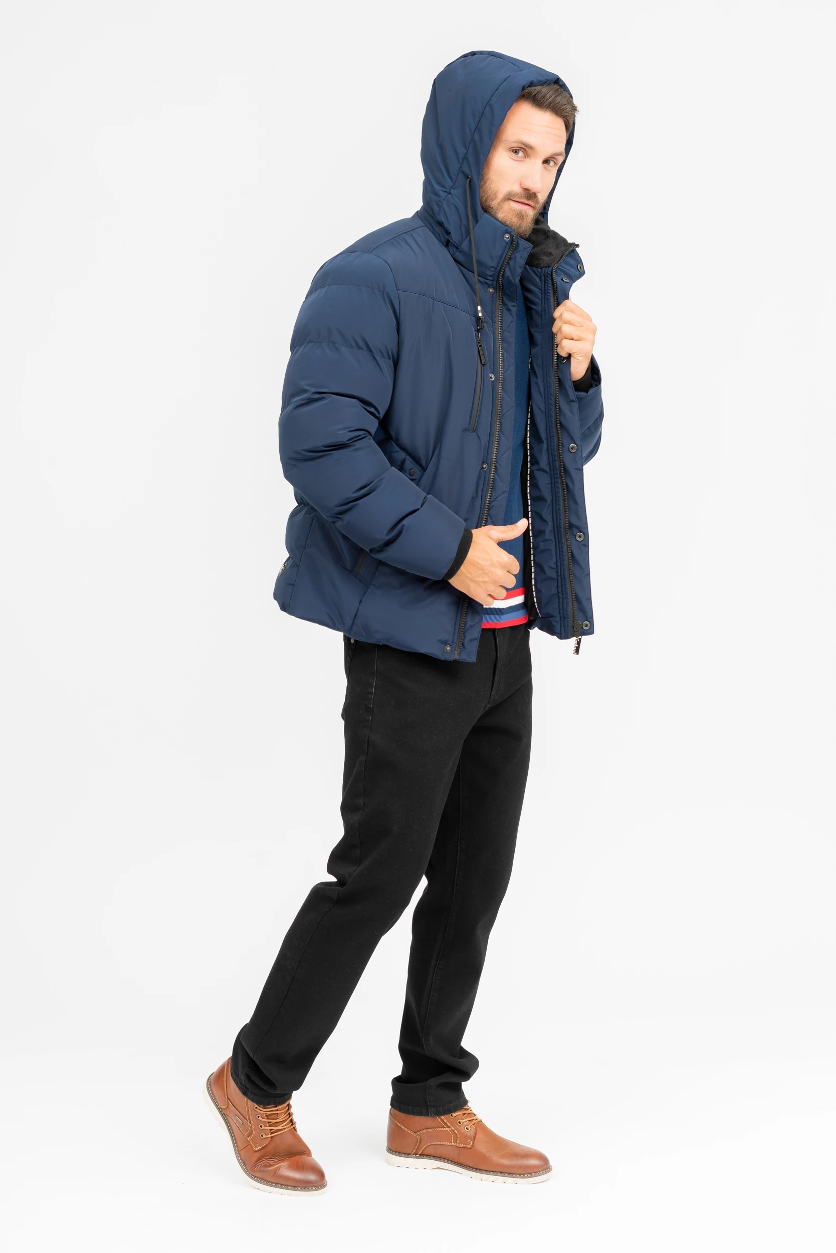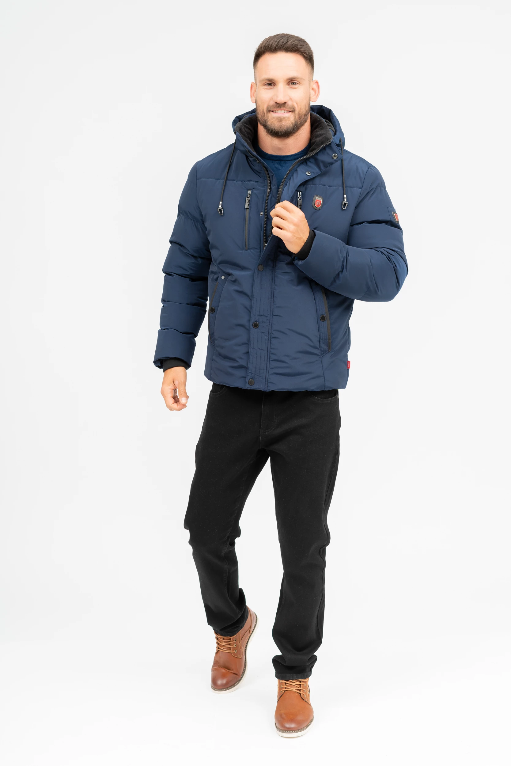 férfi vastag dzsekikapucnija lecipzározhatóbelső zsebekkelujja alján szélfogóvalfémcímkékkel díszítve