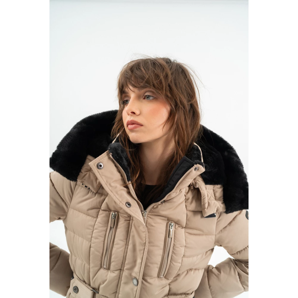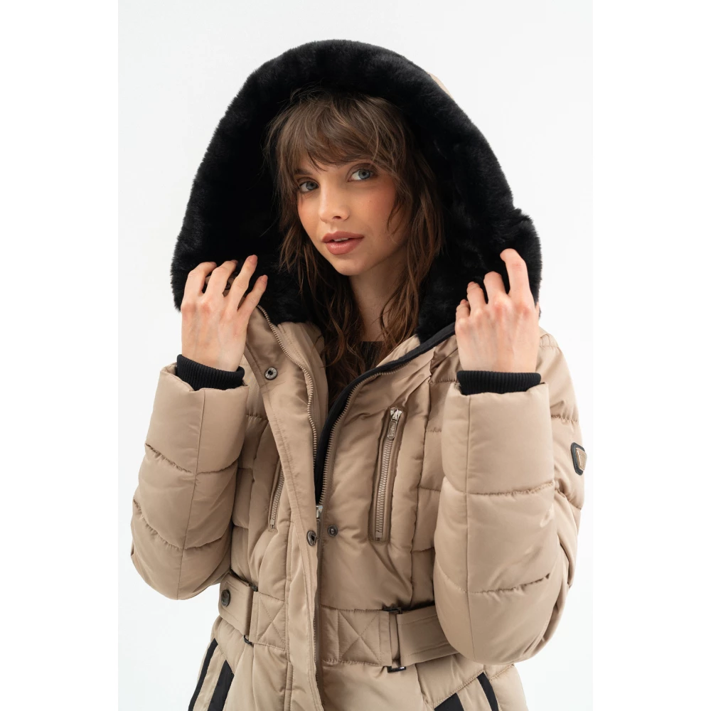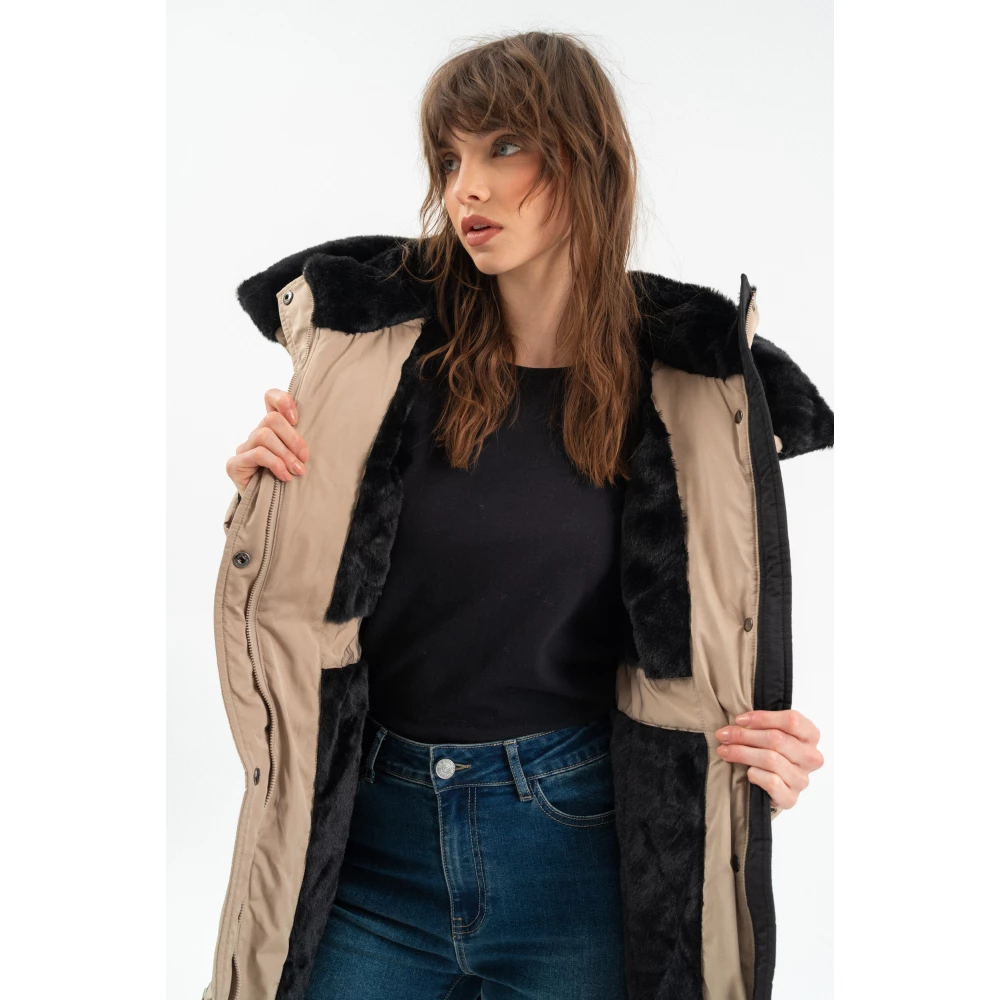 női vastag kabátműszőrme bélésselkapucni lecipzározhatóderekán állítható pántokujja alján szélfogóhímzéssel és fémcímkével díszítve