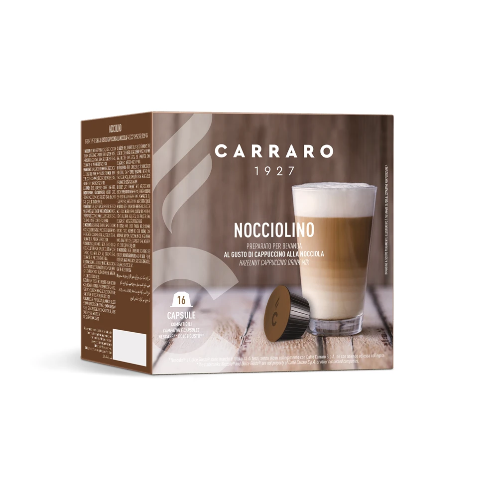 A Carraro Nocciolino Dolce Gusto kávékapszulák ízletes kávéitalokat kínálnak csábító mogyorós jegyekkel, melyeket leginkább egy nagy cappuccino csészében élvezhet. Akár a nap indítására, akár egy pihentető szünetre készül, a Carraro Dolce Gusto gondoskodik a finom kávépillanatról.