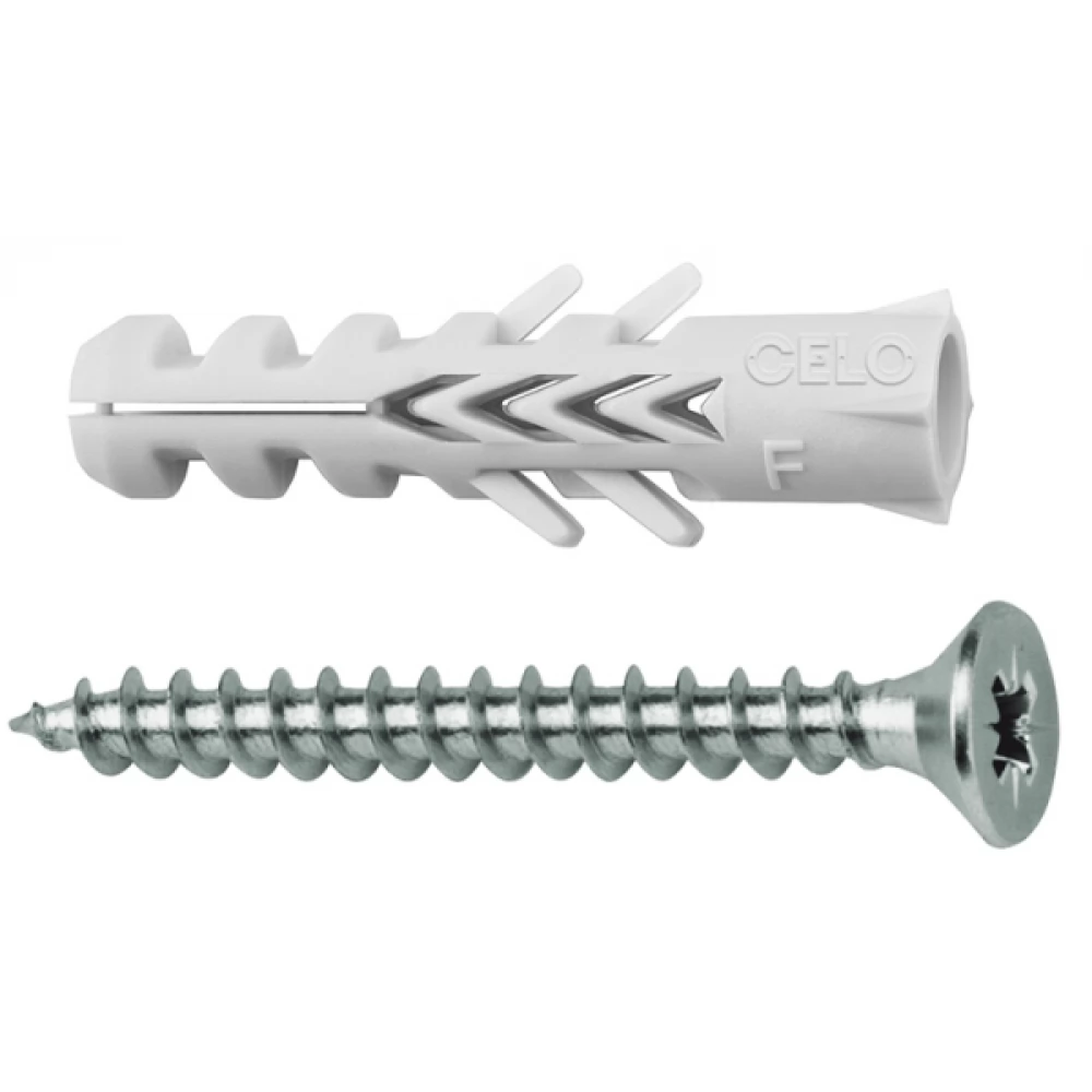 A CELO F általános dűbel nagy tágulási képességének köszönhetően magas kihúzási értékekkel rendelkezik. Széles méret választékban kapható 4-20 mm átmérőig. Az F általános dűbel ideális választás tömör építőanyagokhoz, de üreges tégla és pórusbeton szerkezetekben is jó terhelhetőségi értékekkel bír. Jó csavarvezetése miatt a csavar nem mozdul ki a behajtás során. Az oldalsó szárnyak megakadályozzák a dűbel elcsavarodását a furatban. Robosztus felépítése miatt nem hajlik el a kalapálás során. A dűbel kiváló minőségű és öregedésálló nylonból készül.