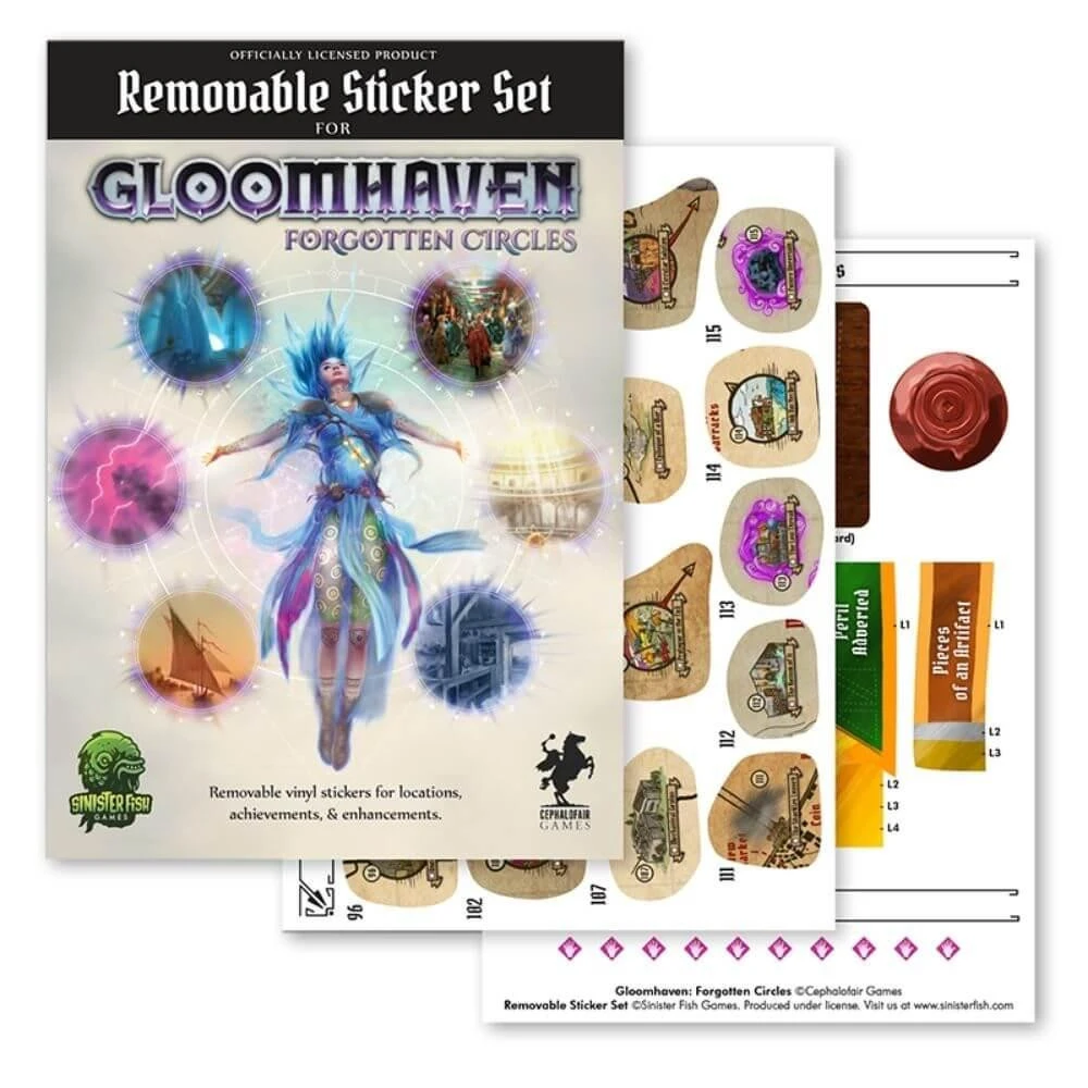 A Gloomhaven kiegészítőjének, a Forgotten Circles-nek a matrica szettje. Akárcsak az alapjáték esetén, ez a csomag is vinilből készült matricákat tartalmaz, amik nem hagynak nyomot, ha újra akarjátok...