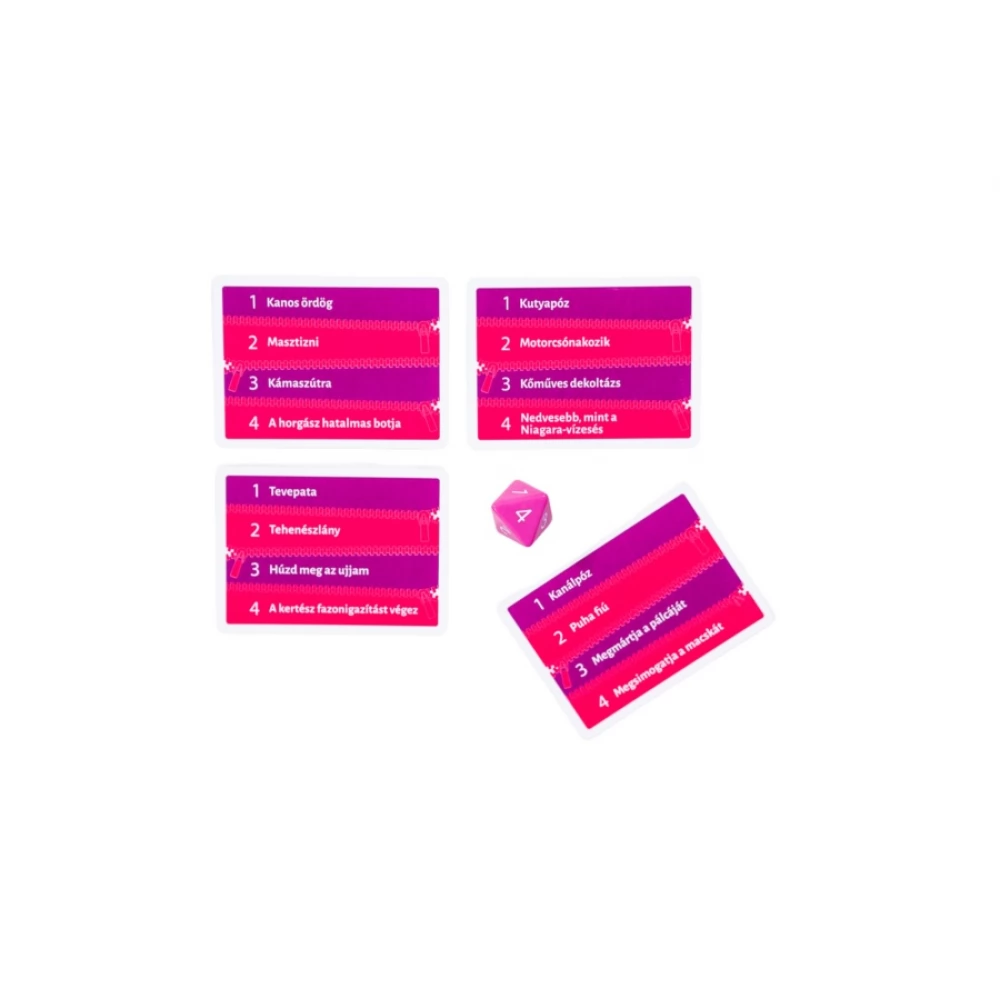 Dobjatok a kockával, hogy meghatározzátok, melyik csapat kezd - aki nagyobbat dob, az lesz a kezdőcsapat. Húzzatok egy feladványt - a kezdő mutogató válasszon egy feladványt a 4 közül és máris mehet a mutogatás (szigorúan nem magamutogatás!). Minden kártyán négy szexi feladványt találtok, ezeket bonyolultság szerint osztályoztuk: