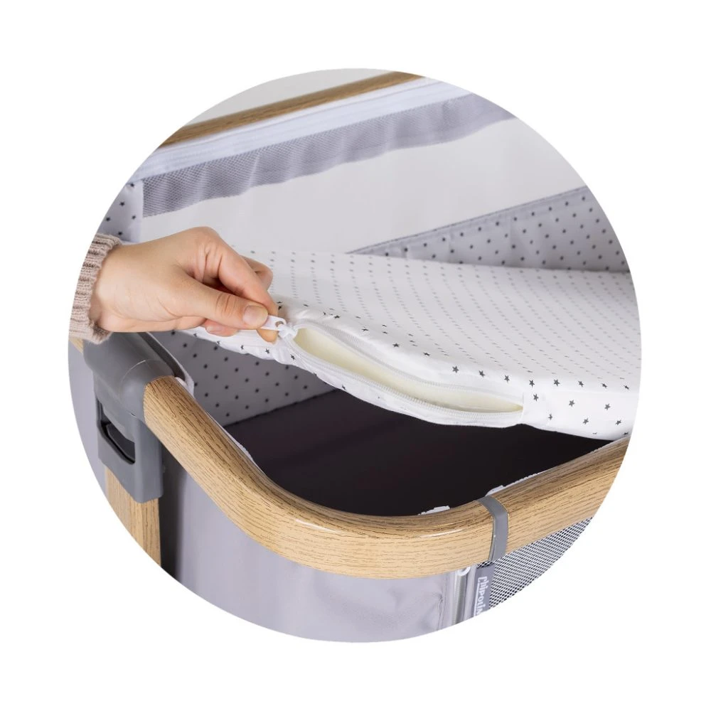 - A lehajtható oldal segítségével könnyedén a saját ágyadhoz rögzítheted, így a baba mindig közel lehet éjszakai etetéskor és összebújáskor, mégis megmarad a saját biztonságos alvótere.