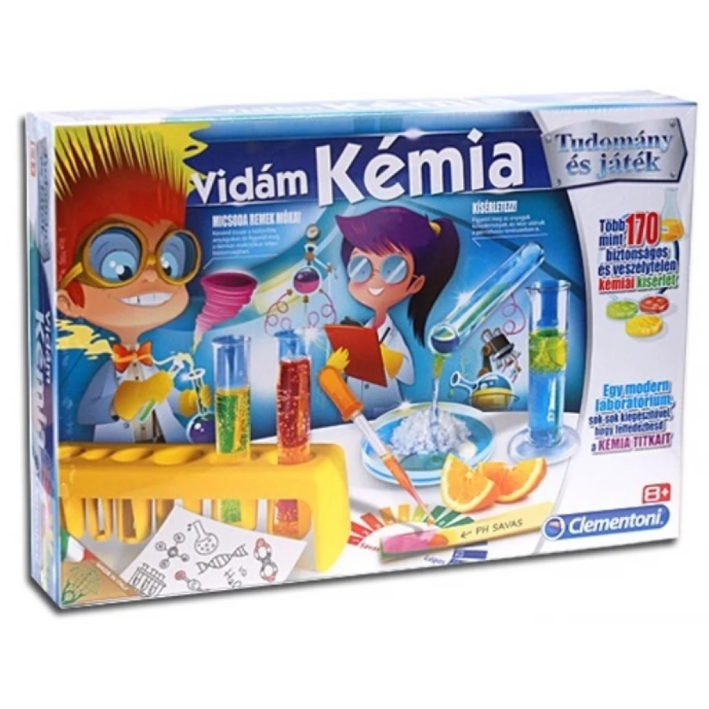 A kémia mindennapi életünk során folyamatosan körülvesz bennünket. Otthonunkban leginkább a konyhában és a fürdőszobában fogyasztunk vagy éppen használunk különböző kémiai anyagokat. A Clementoni - Tudomány és játék - Vidám Kémia készlet játékos feladataiban a gyerekek megismerhetik a kémia alapvető fogalmait a halmazállapotoktól az indikátorokon át egészen a molekula modellekig. A kísérletek a laboratóriumi kellékek segítségével precízen hajthatóak végre.
