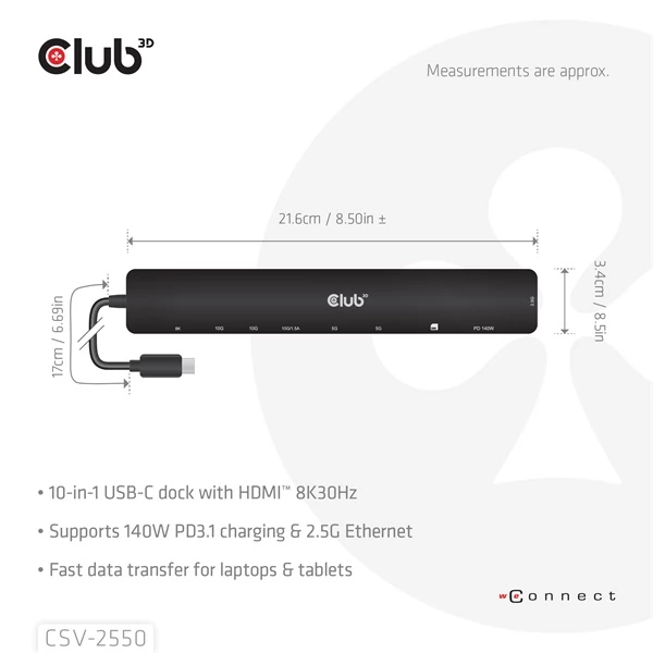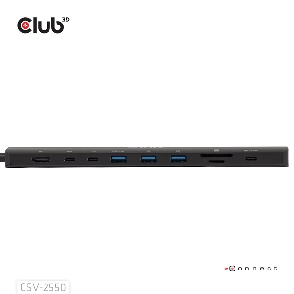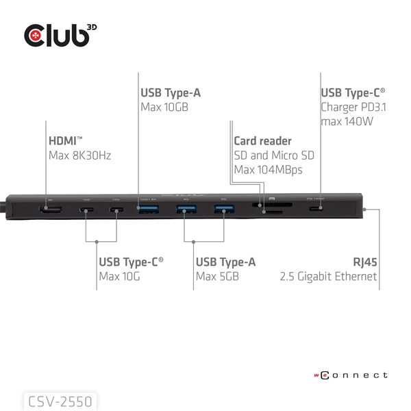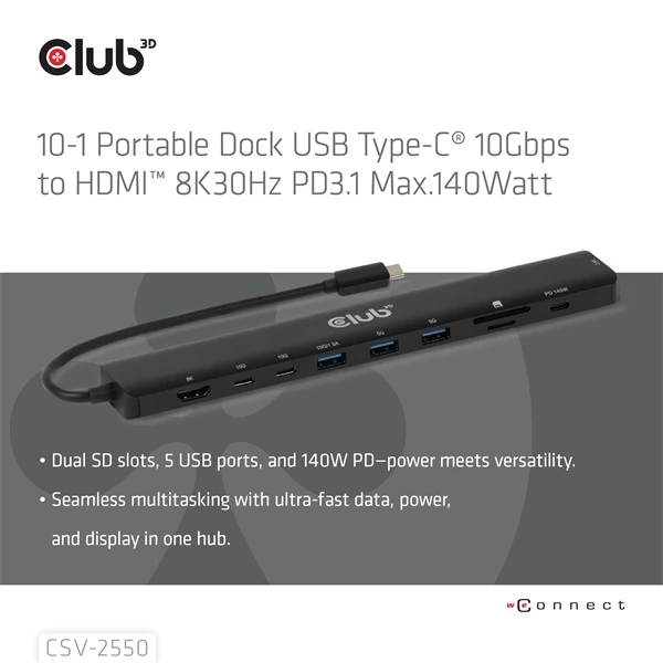 A Club 3D CSV-2550 egy 10-1 Hordozható Dokkoló USB Type-C® 10Gbps - HDMI™ 8K30Hz PD3.1 Max. 140Watt, amely ideális megoldást kínál az USB Type-C® vagy Thunderbolt® gazdagépek (PC/Laptop/Mobiltelefon stb.) portjának bővítésére, különösen azoknak a gazdagépeknek, amelyek egyetlen USB Type-C® porttal rendelkeznek. Ez a hub lehetővé teszi a HDMI™ kimenetét maximum 8K30Hz vagy 4K144Hz magas frissítési frekvenciával, a természetesebb és simább vizuális élmény érdekében, miközben USB 10Gbps adatátvitelt végez. A 3x USB Type-A és 2x USB Type-C® adatport lehetővé teszi 5 USB eszköz egyidejű csatlakoztatását. Az SD/Micro SD lehetővé teszi 2 kártyahely egyidejű behelyezését adatátvitelhez vagy információk írásához/olvasásához a gazdagépen. Az RJ45 port lehetővé teszi a gazdagép számára a 2,5 gigabites Ethernet elérését. Emellett az USB Type-C® anya támogatja a PD 3.1-et, maximum 140 W-os PD töltéssel. Minden DP Alt módot támogató USB Type-C® gazdagéppel működik.