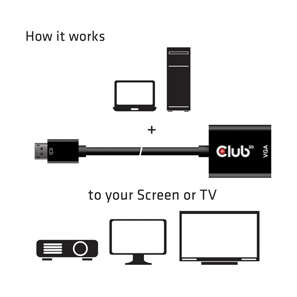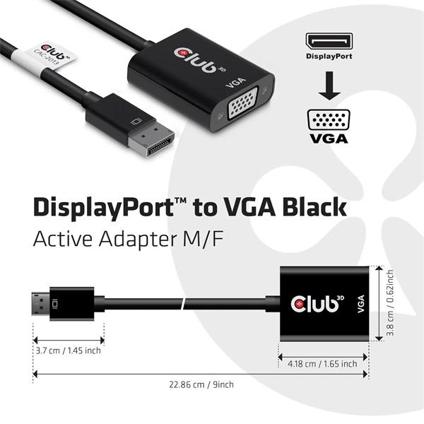A Club 3D CAC-2013 egy aktív DisplayPort™-VGA jelátalakító, amely lehetővé teszi, hogy az analóg VGA televíziókat, monitorokat vagy projektorokat csatlakoztassuk a DisplayPort™ kimenettel rendelkező asztali számítógépekhez vagy laptopokhoz. Az adapter plug and play funkciót kínál, nincs szükség illesztőprogram telepítésére, és a DisplayPort™ kimenet táplálja.
