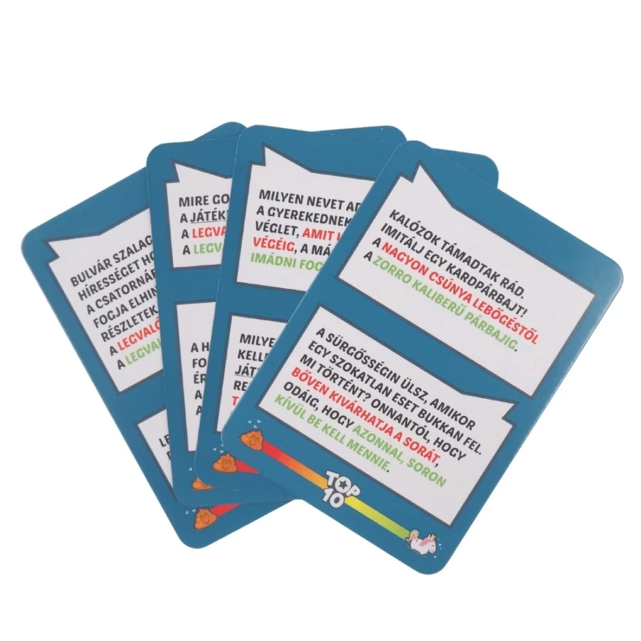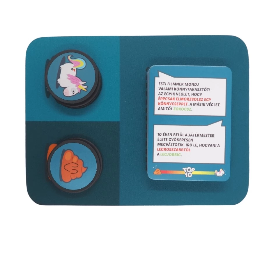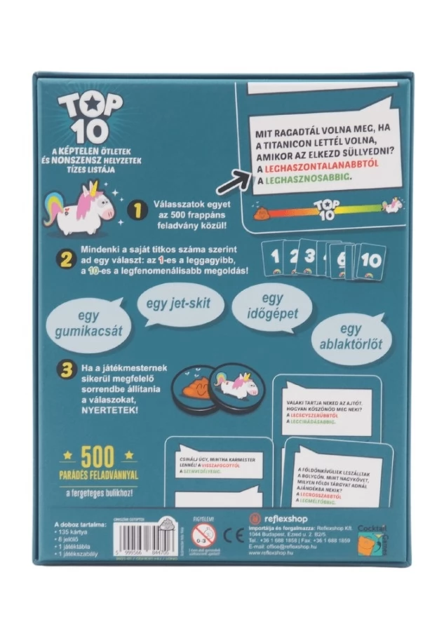 Milyen hangokat hallhatnál egy kísértet járta házban? Milyen tárgyat adnál ajándékba a földönkívülieknek? Ahány ember, annyi válasz, de vajon lehetséges ezeket sorba rendezni? A Top10 party játékban a játékosok a képtelen ötletek és nonszensz helyzetek tízes listáját alakítják majd, és kooperatívan igyekeznek rávezetni a játékmestert a helyes sorrendre. Végtelen kreativitás és közös móka a skálán!