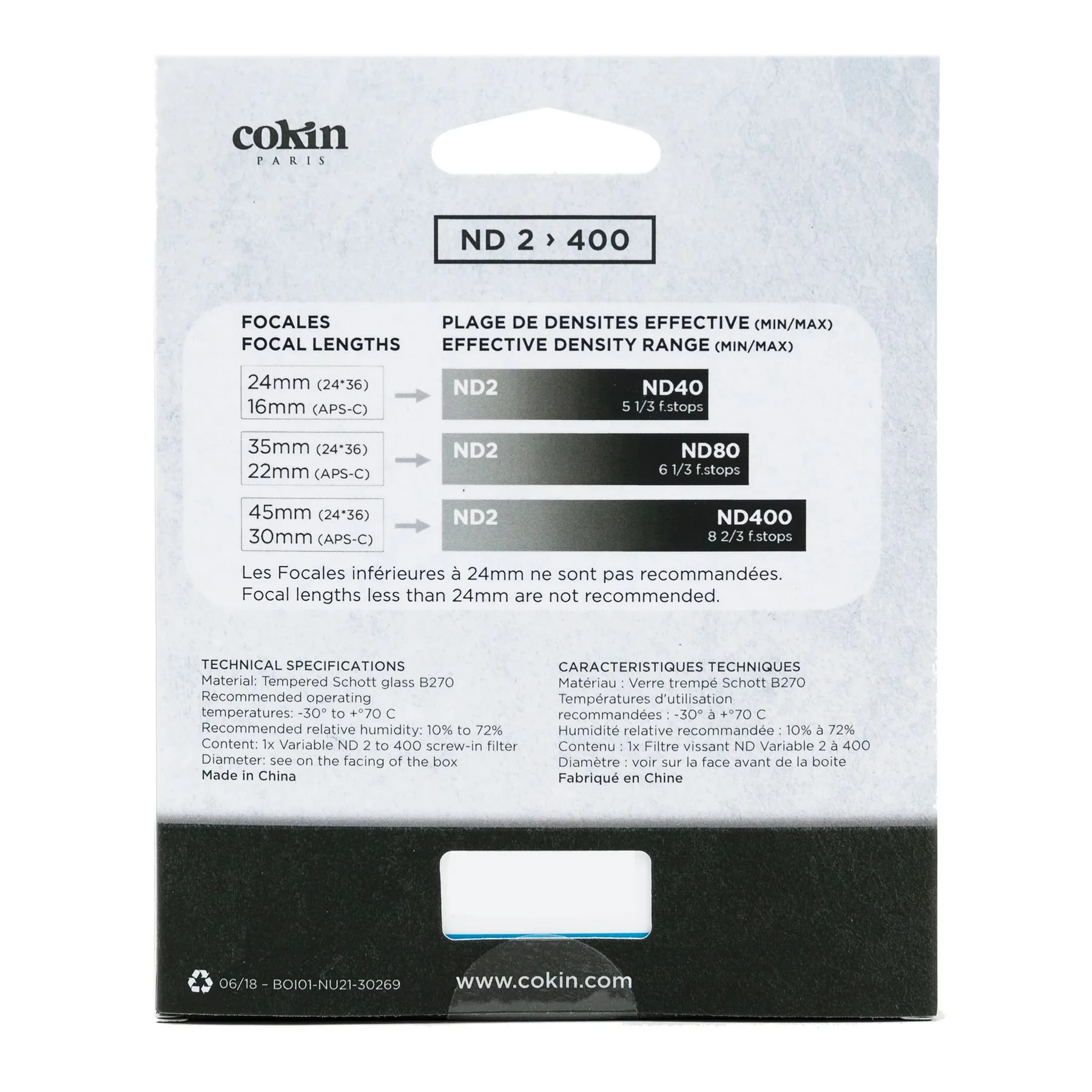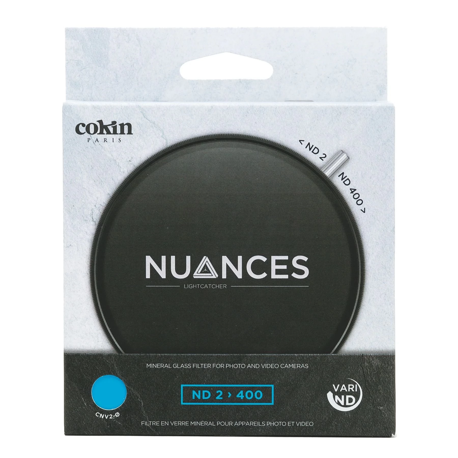 A Cokin Variable ND2-400 szűrő egy változtatható semleges szürke szűrő (ND), mely 1 és 8 fényerő csökkenést biztosít fokozatmentesen. Az ND szűrő sötétebbé teszi az egész képet, lehetővé téve a normálnál nagyobb rekeszértékkel, vagy hosszabb záridővel történő fényképezést. A sötétedés mértéke könnyen szabályozható az elülső szűrőgyűrű elforgatásával, melyet pontokkal jelöltek a pontos pozícíonálás érdekében. A precíz beállítást az elülső gyűrűn lévő forgatókar biztosítja.