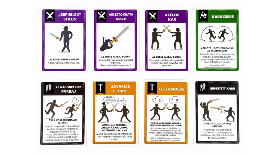A választott kártyakupac a párbaj szabályait is meghatározza: mikor kell a vívóknak meghajolniuk, hogyan fogják meg a kardot, érintkezzenek-e a térdek közben (vagyis „bepisilek” stílusban kell megküzdjenek), zsonglőrködjenek, számoljanak-e le… azaz be csörte közben. És a kisebb játékosoknak sem kell a vereségtől tartaniuk: nekik esélykiegyenlítő szabályok segíthetnek!