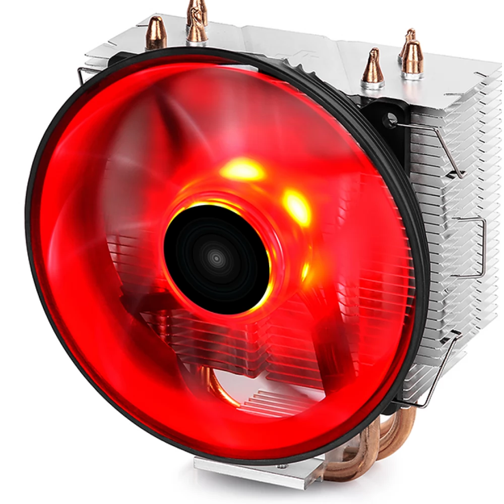 Klasszikus torony kialakítású, hővezető csöves univerzális CPU hűtő egy darab 120mm-es piros LED világítású, PWM vezérlésű ventilátorral.