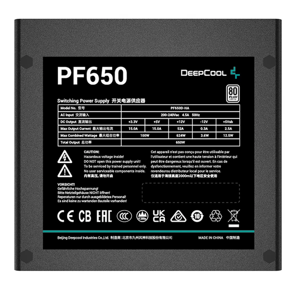 A DeepCool PF650 650W egy megbízható, 650 wattos ATX12V V2.4 szabványú tápegység, amely 80 Plus tanúsítvánnyal rendelkezik. Tipikus terhelésen (50% terhelés) legalább 85%-os hatékonyságot biztosít, ami energiatakarékos működést jelent. A DeepCool PF sorozatú tápegység biztonságos és stabil tápellátást kínál. Kiváló választás olyan új rendszerek építésénél, vagy meglévők továbbfejlesztésénél, ahol fontos szempont a halk működés és a stabil, hatékony teljesítmény.