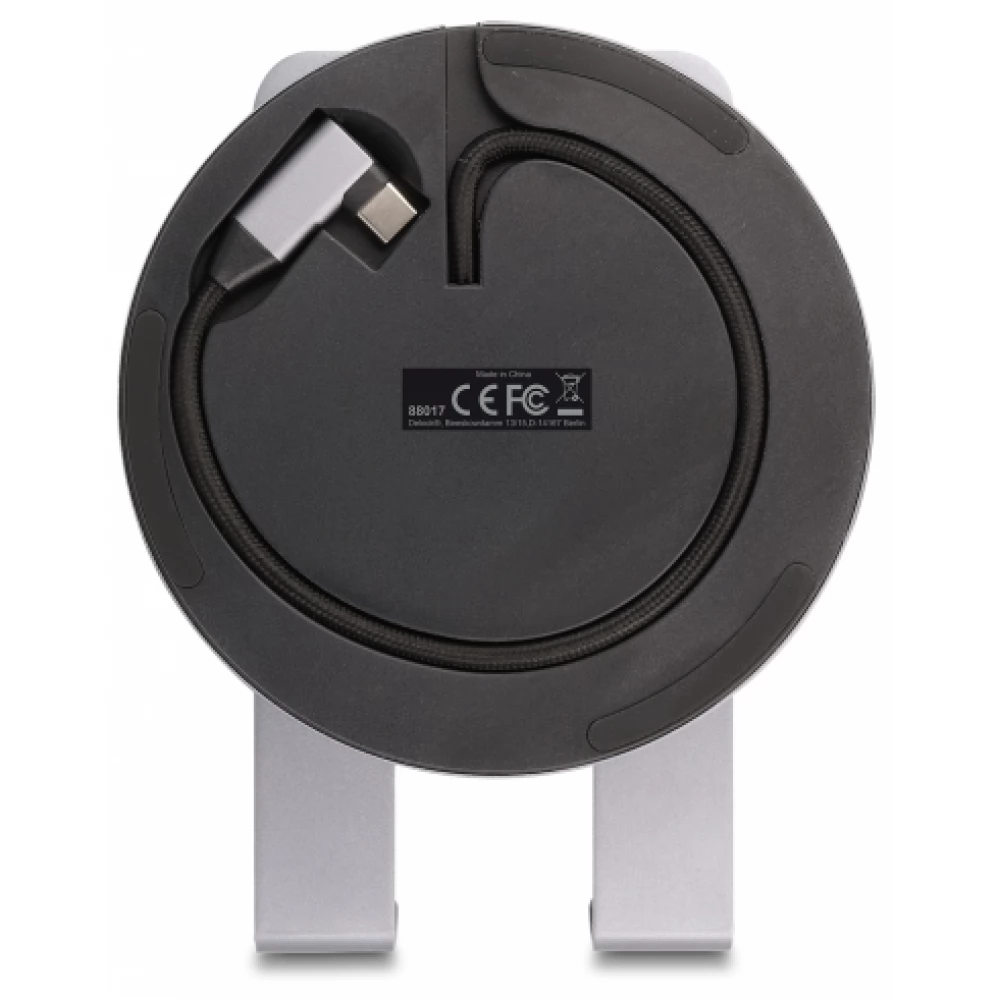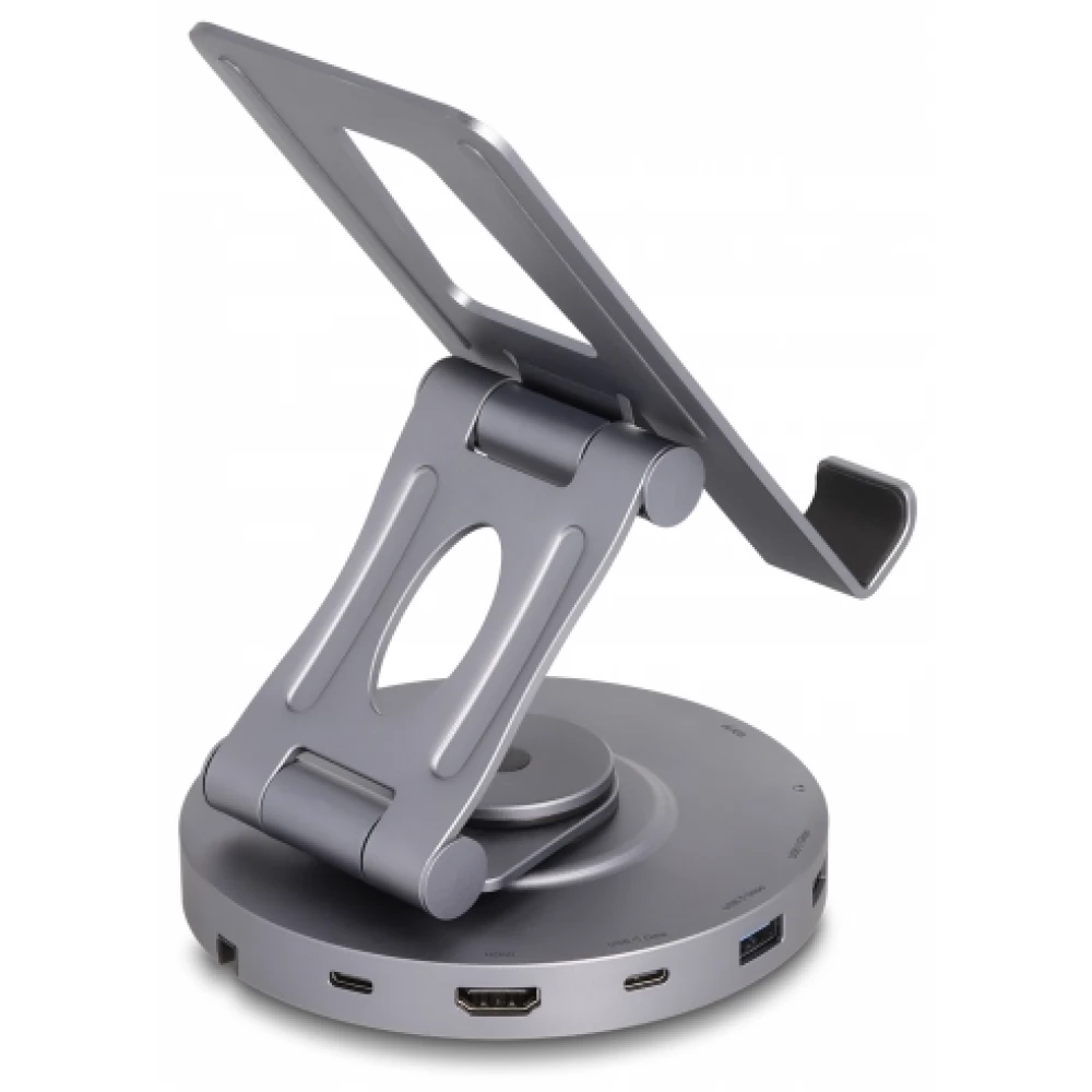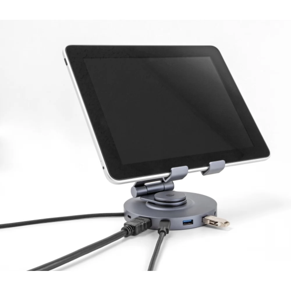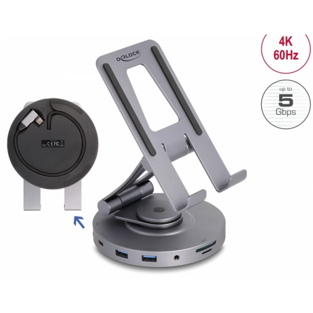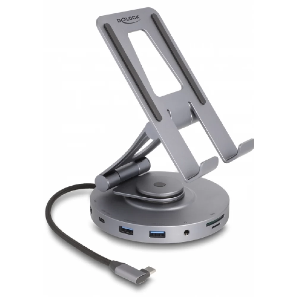 Ez a Delock dokkoló állomás tabletekhez és laptopokhoz tartóval nemcsak kialakításával megnyerő hatású, például a 360 fokban forgatható tartójával, de stabilitásával és funkciójával is. A gumírozott párnák a tartó alján biztosítják, hogy sem az eszköz, sem az állvány nem csúszik el.