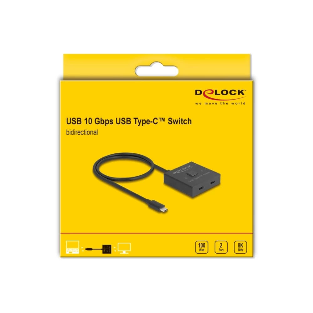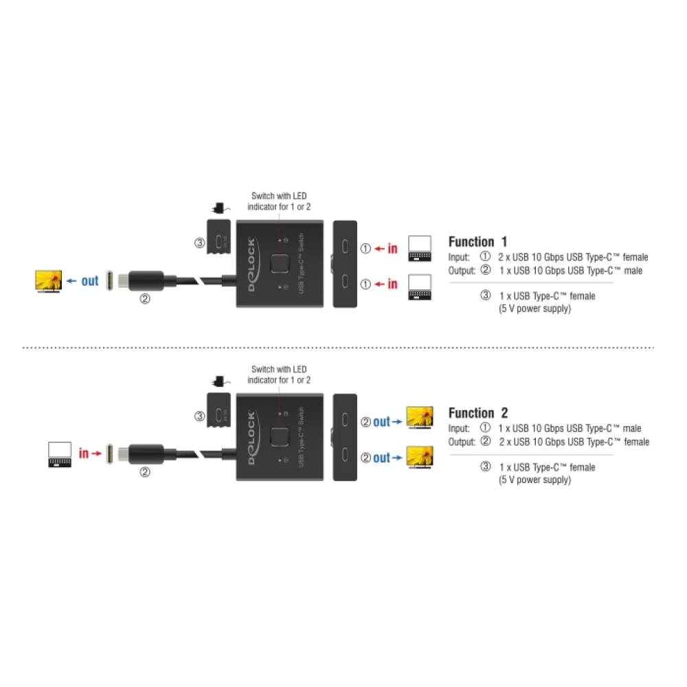 Ez a Delock USB Type-C™-kapcsoló egy manuális, kétirányú kapcsoló különféle, USB Type-C™-porttal rendelkező eszközök csatlakoztatásához. A kapcsoló két különböző alkalmazást kínál.
