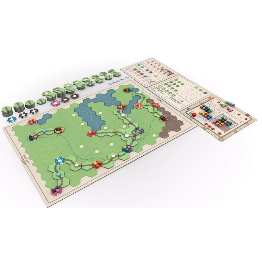 Tartozékok: 3 kétoldalú játéktábla, 136 vágánylapka, 3 tábla, 8 Új Város-lapka, 180 vágánytulajdonjog-korong, Pénz, 1 fordulójelző, 110 árukocka, 8 településkorong, 1 szövetzsák, 6 dobókocka.
