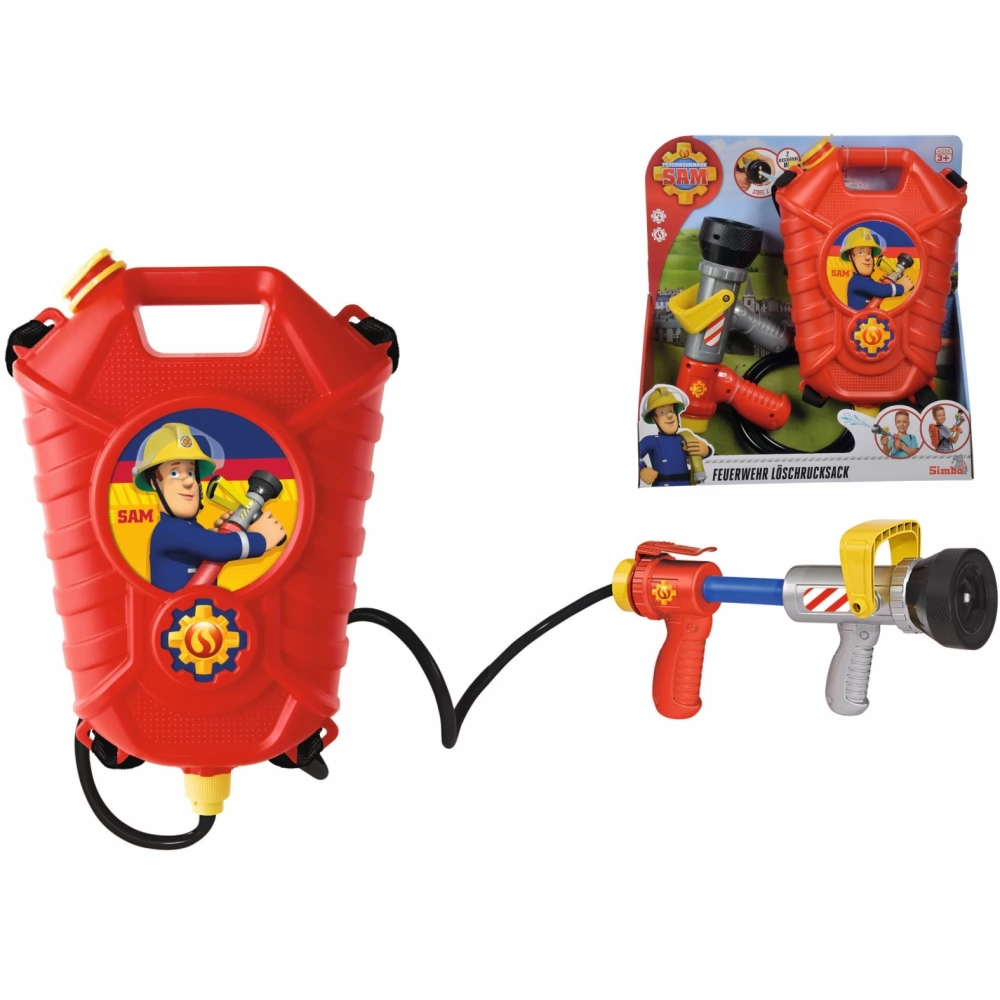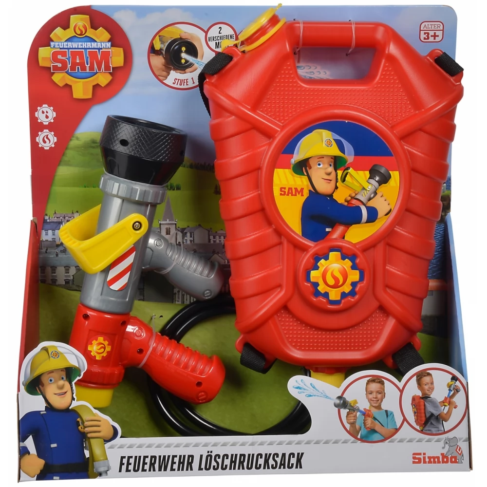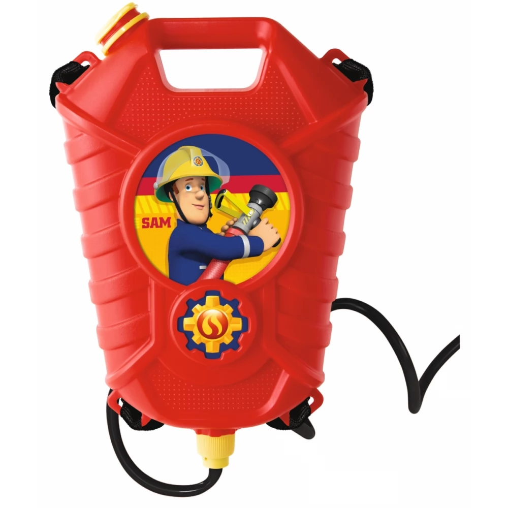 Különleges, 23cm-es Sam a tűzoltó fecskendős hátizsák, amivel a gyerekek átélhetik, milyen tűzoltónak lenni. A hátizsák tartályát vízzel megtöltve egy pumpás mechanizmus segítségével lehet vizet spriccelni.