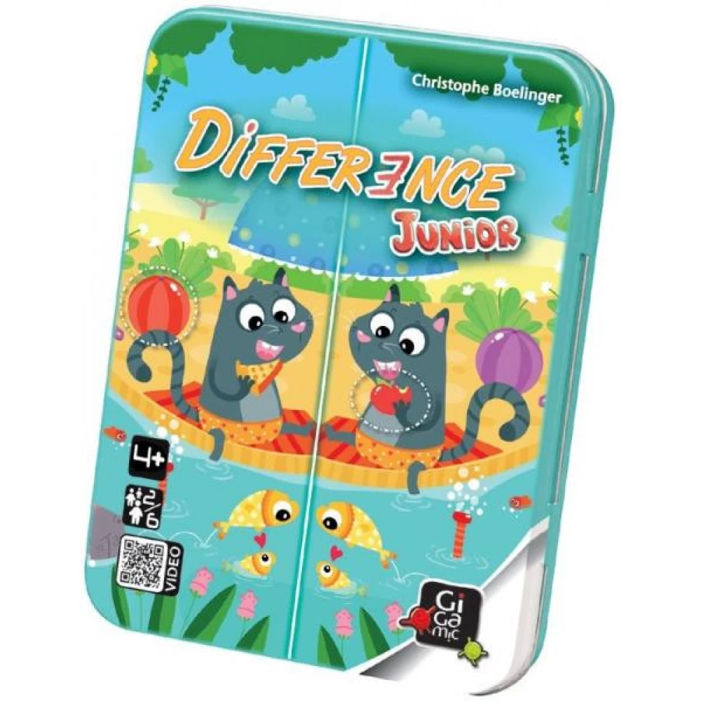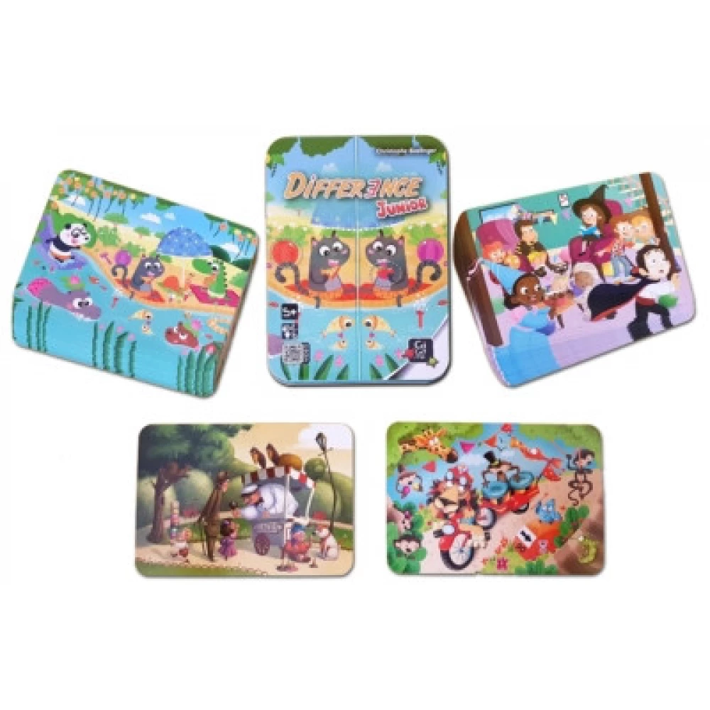 Csak két különbség… hol lehetnek? A cica mögötti labda színe az egyik. És igen, itt a másik: az egyik képen almát eszik, a másikon sajtot! A Difference Junior-ban nincs más dolga a gyerekeknek, mint megtalálni két nagyon hasonló kép között a két eltérést. Kedves kis állatok játszanak a színes képeken, pandák, madarak, vízilovak úszkálnak és várják huncut módon, ki veszi észre leghamarabb a különbséget - és tarthatja meg így a kártyákat! A nagysikerű Difference gyerekváltozata, amit már óvodás korban is lehet játszani!