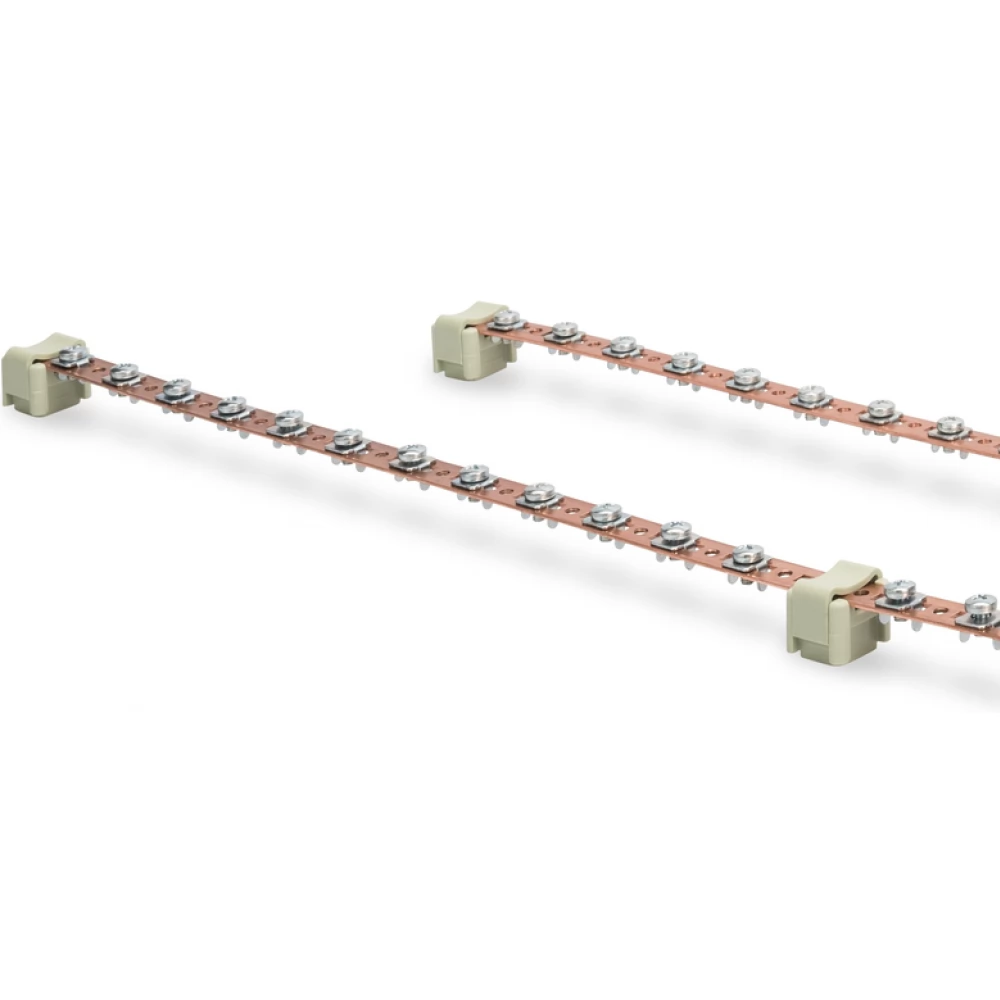 The potential equalization bars can be easily mounted to the profile rails of your rack in order to connect your necessary components. There are two versions available: The short version (220 mm length) has a total of six connection points. The long version is a set consisting of two 820 mm long bars with each 24 connection points (48 in total) which also includes a short earthing wire to connect both bars.