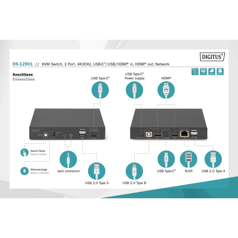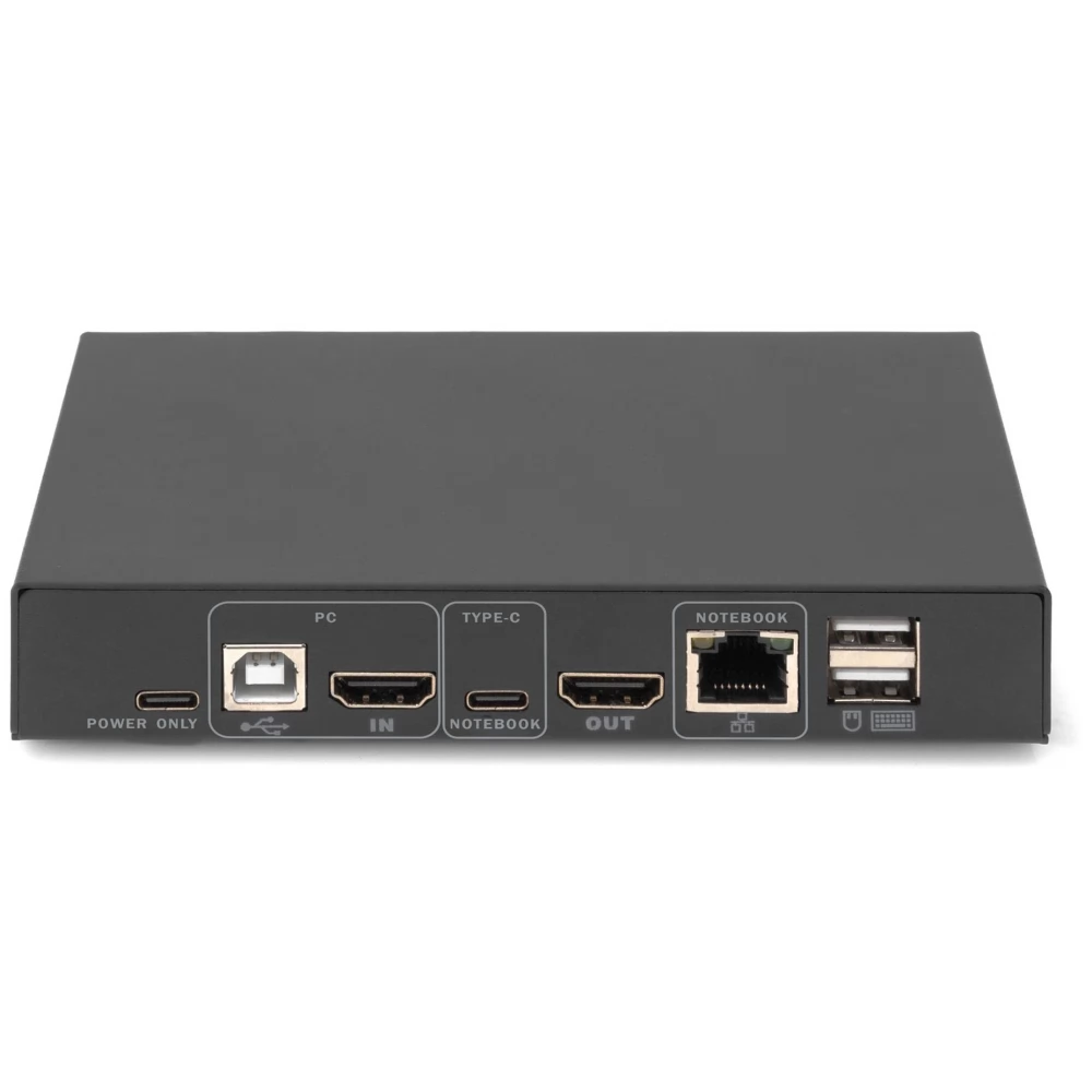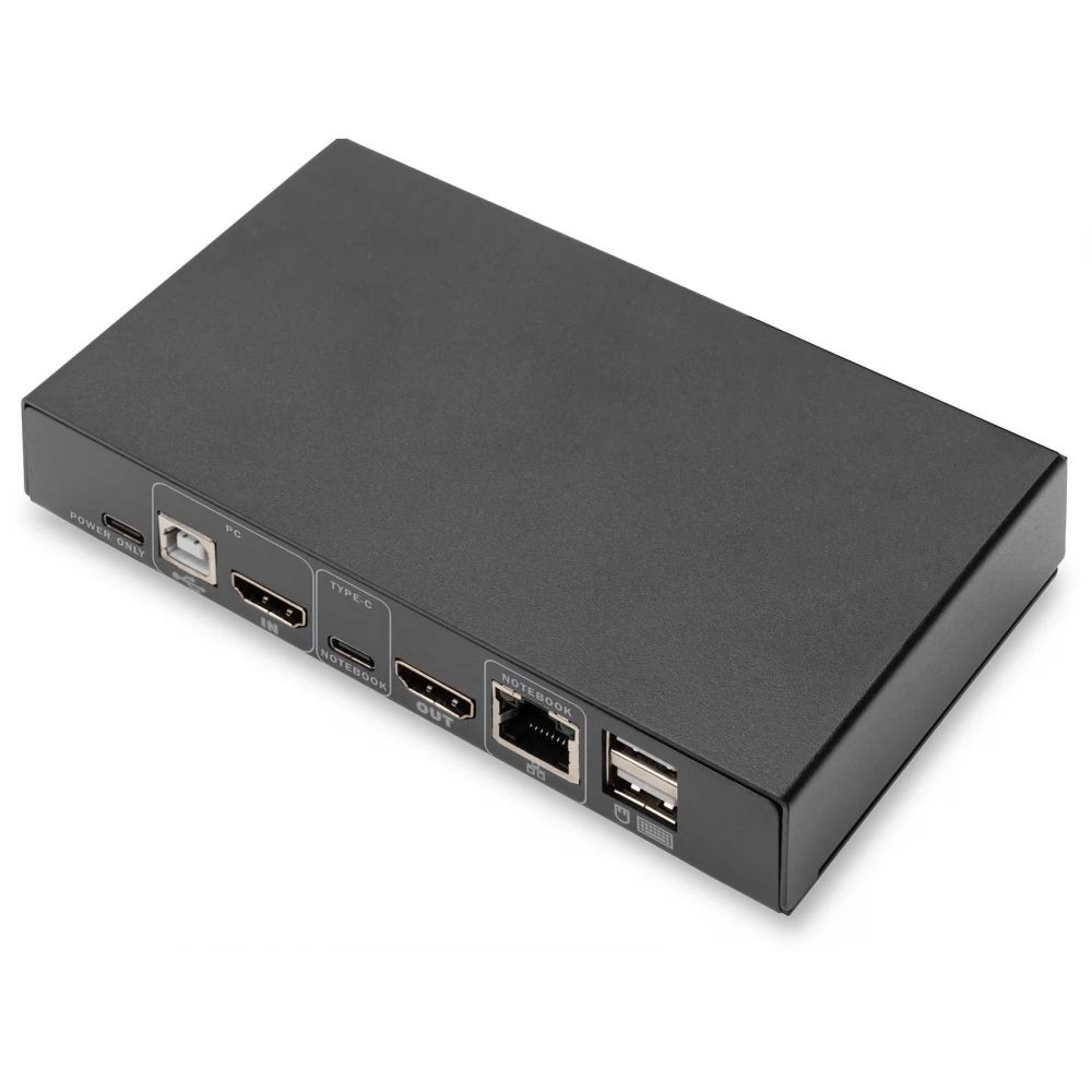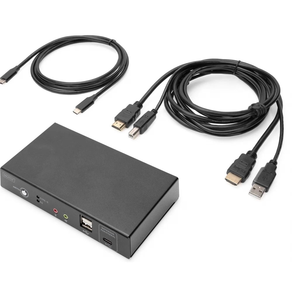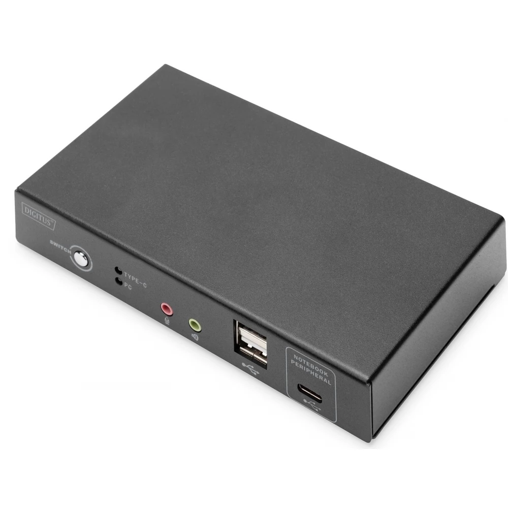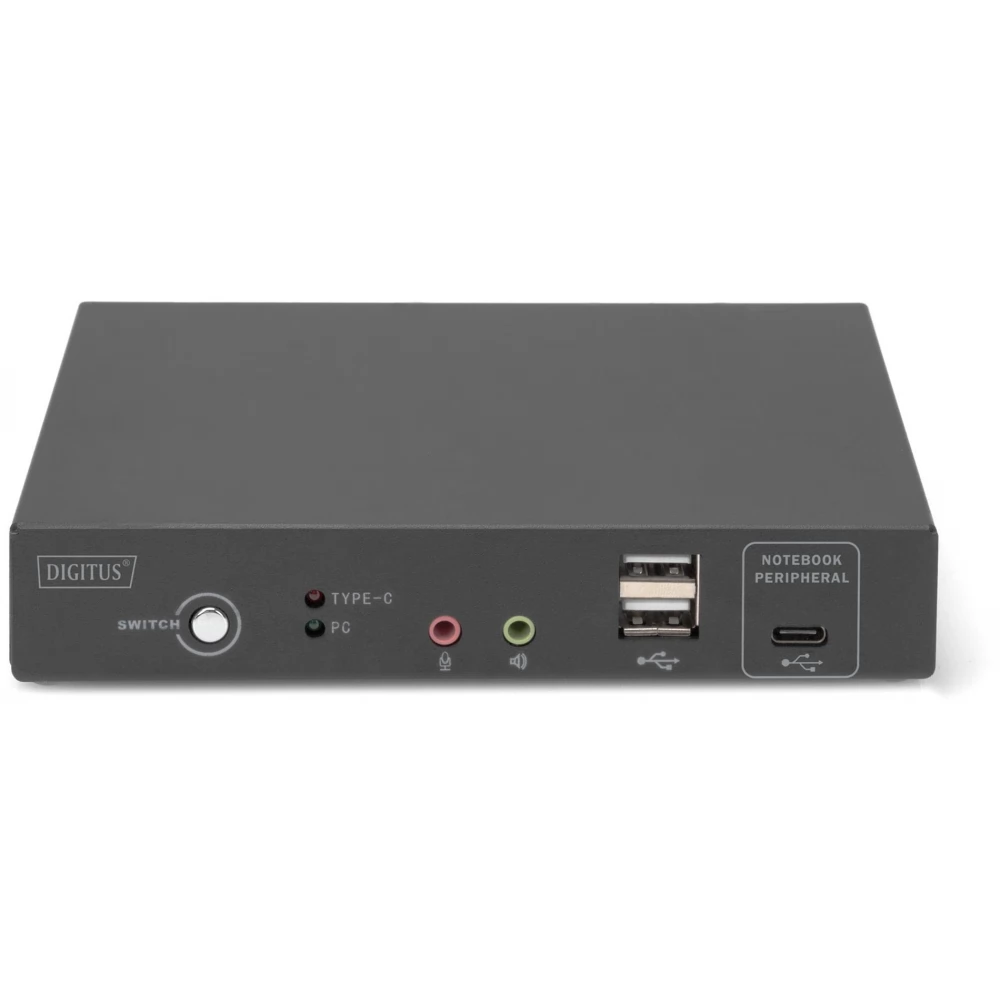 A DIGITUS® 2 portos KVM switch USB-C™-vel és hálózati csatlakozással lehetővé teszi két 4K-képes számítógép vezérlését egyetlen USB-billentyűzetről és egérről. Egy gombnyomással kényelmesen válthat a két számítógép között, így nincs szükség az összes kábel újracsatlakoztatására. A Gigabit hálózati port kényelmes hozzáférést biztosít a hálózathoz a kiegészítő USB-C™ porton keresztül. A monitorra történő kimenet a beépített HDMI-kimeneten keresztül történik. A mikrofonból és a hangszórókból érkező hangjelek is kapcsolhatók. Ezenkívül egy másik USB-C™ port és két USB A (2.0) port is elérhető az előlapon, amelyek további perifériákhoz, például USB-meghajtókhoz vagy külső merevlemezekhez használhatók. A kapcsoló elején található állapotjelző LED-ek folyamatosan mutatják az aktuális állapotot. A vékony kapcsolót a robusztus fémház teszi teljessé.