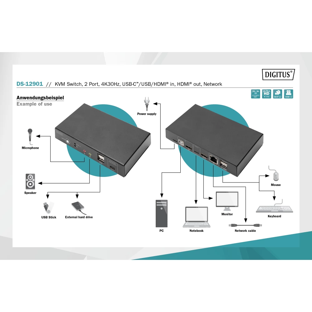 DIGITUS DS-12901 KVM Switch 2 Port 4K30Hz