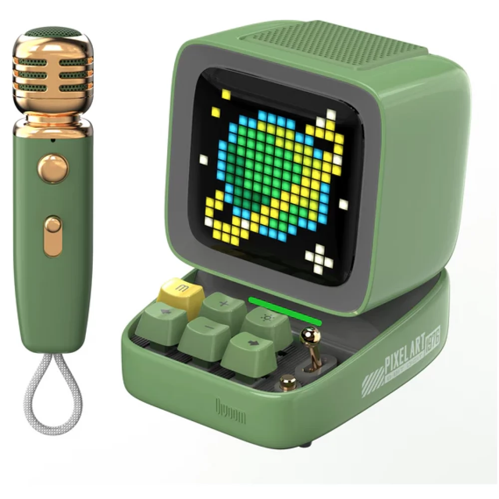 A Divom Ditoo Mic vezetéknélküli hangszórója különleges, retro megjelenésével, tökéletesen felidézi a régmúlt emlékeit. Interaktív kijelzője jelzi a különböző közösségi oldalak (Facebook, Instagram, Twitter stb.) értesítéseit, lehetőséget nyújt mini pixel játékok játszására, valamint képes tájékoztatni az időjárásról. Beépített mikrofonnal rendelkezik, akár utasításokat is adhatunk neki, valamint üzenetet hagyhatunk szeretteink részére. Kijelzőjén megjelenő pixel képeket, grafikákat egy speciális telefonos alkalmazással módosíthatjuk, kedvünk szerint testreszabhatjuk. Ezeken felül a hangszóró vezeték nélkül is használható, egy töltéssel akár 8 óra zenehallgatást tesz lehetővé. A Ditoo Mic karaoke vezeték nélküli mikrofonnal, 7 különböző hangmóddal és karaoke funkcióval rendelkezik.