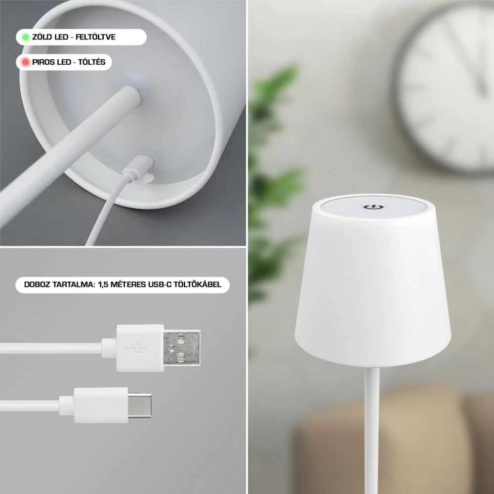 - Hordozhatóság és hosszú üzemidő: A lámpához tartozik egy 1,5 méter hosszú USB-C kábel a töltéshez, így könnyen újratölthető. Akkumulátoros működése akár 10 órás üzemidőt tesz lehetővé egyetlen feltöltéssel.