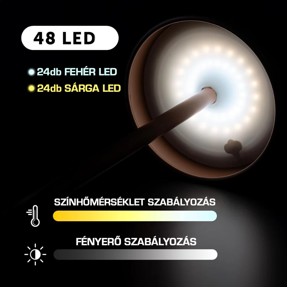 - Állítható fényerő és színhőmérséklet: A lámpa fényereje és színhőmérséklete több fokozatban állítható, így könnyedén alkalmazkodik az adott környezet hangulatához és igényeihez.