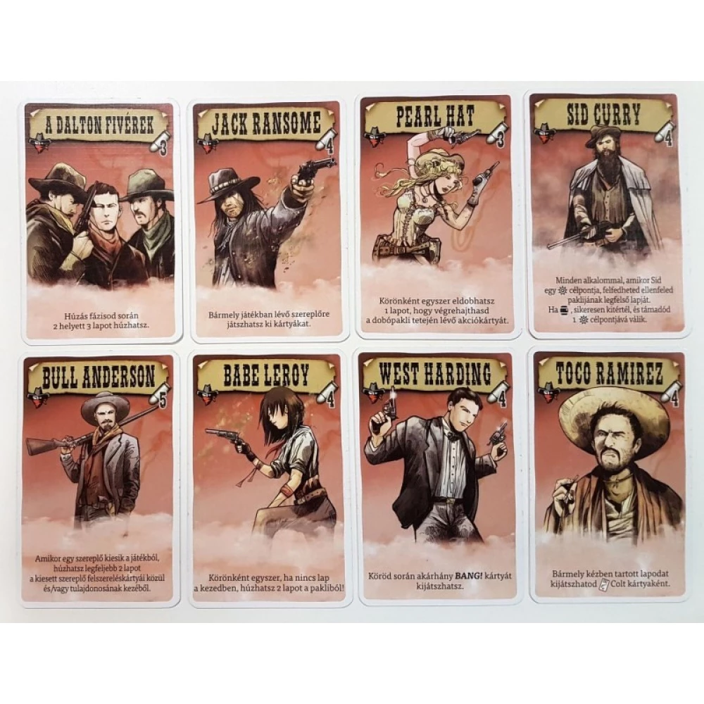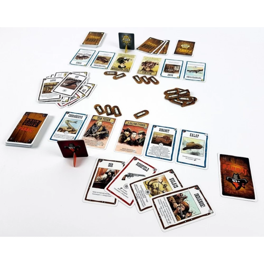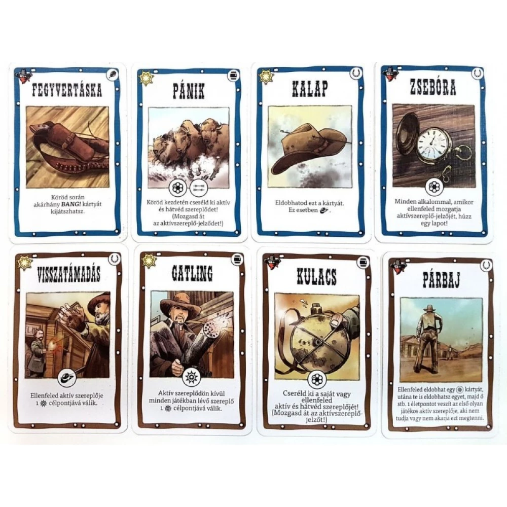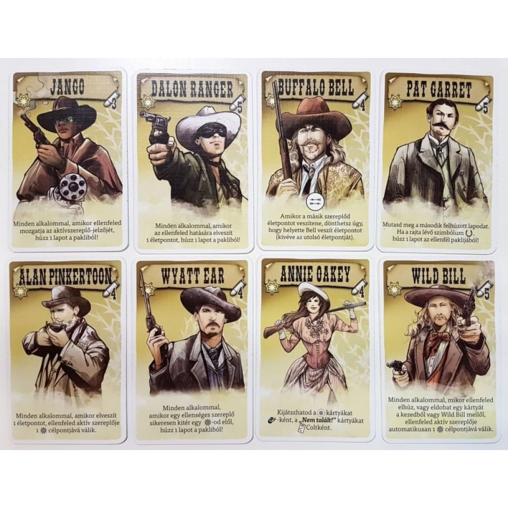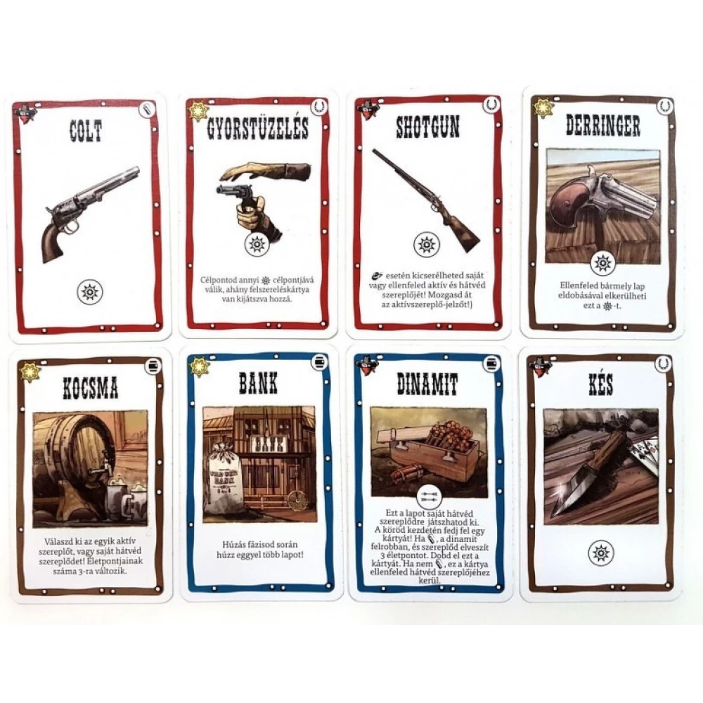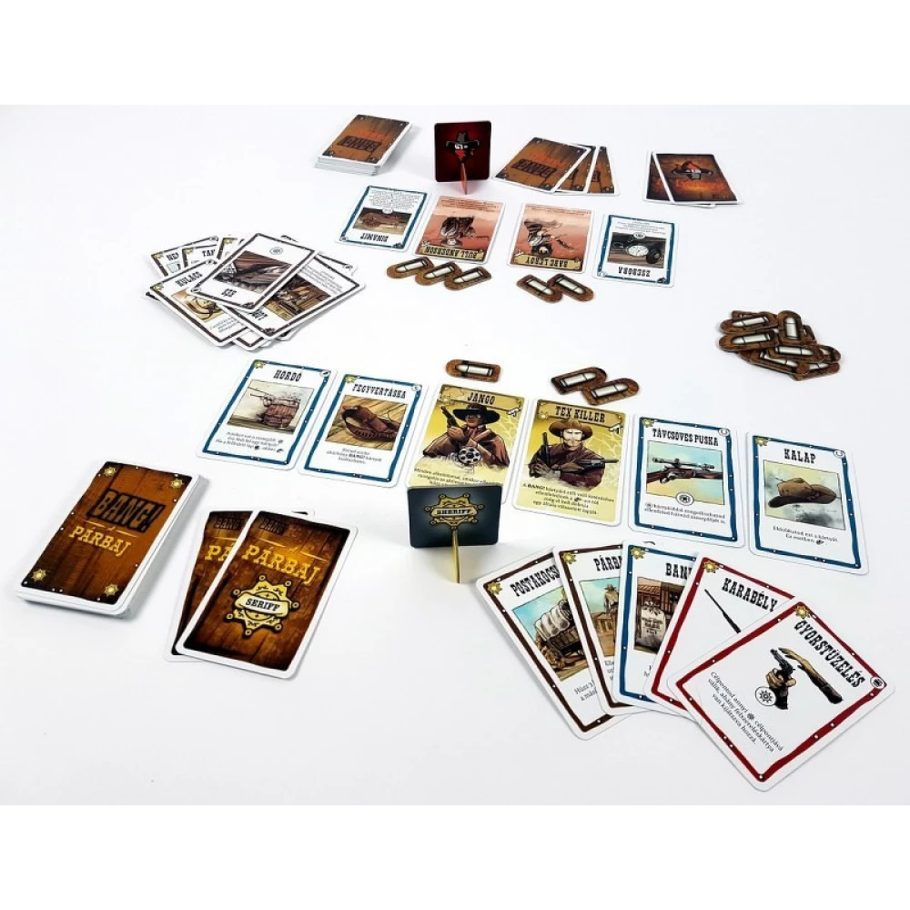 - 7 darab szerepkártya: 1 seriff, 2 seriffhelyettes, 3 bandita, 1 renegát
