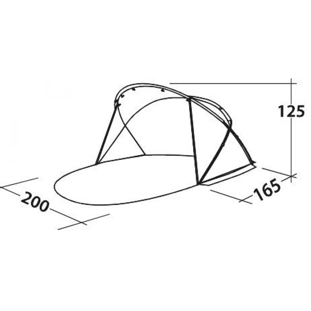 A kör alakú hordtáskából egyenesen kinyíló, nyitott homlokzatú kialakítás és beépített, tartós polietilén talajtakaró három oldalról biztosít védelmet a napsütéssel, széllel és enyhe esővel szemben, anélkül, hogy elzárná a kilátást – különösen kicsiknek hasznos. Guylines segít megtartani a formát.