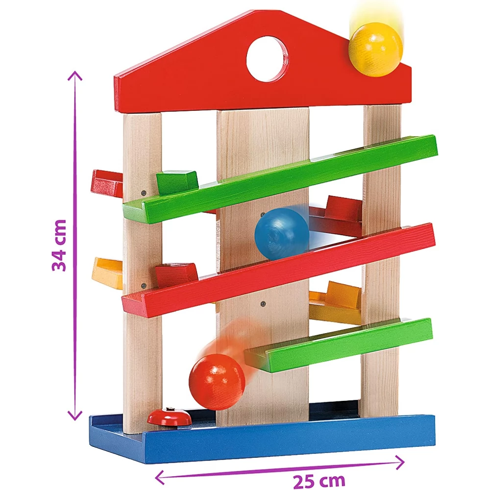 Különleges fa golyópálya ksiebb gyerekeknek 3 darab golyóval. A pálya alján egy kis harang található, amit a leérkező golyók megütnek.
