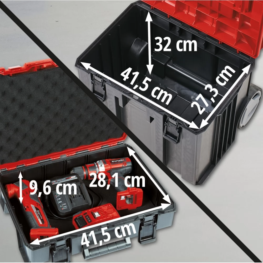 Az Einhell E-Case torony a moduláris E-Case rendszercsalád tagja. A szerszámgépek szállítására és tárolására tervezett Einhell E-Case L a moduláris E-Case rendszercsalád tagja. Az egymásra helyezett koffereket egymáshoz rögzítheti a praktikus zárrendszer segítségével, így az Einhell koncepciója helytakarékos, biztonságos és rendezett tárolást tesz lehetővé. A rendkívül masszív hő- és ütésálló koffer polipropilénből készült. A stabil konstrukció révén akár 120 kg összterhet is tárolhat benne. A kihúzható és extra széles markolatnak köszönhetően rendkívül egyszerű a szerszámgépek tárolása és szállítása. A nagy kerekek könnyű mozgatást tesznek lehetővé, bármilyen felületen húzza is a koffereket. Az intelligens kialakításnak köszönhetően a koffer fröccsenő víz ellen védett, így a viszontagságos időjárás sem árthat neki A maximális kényelemről a rögzíthető fogantyú gondoskodik, melynek segítségével sokkal könnyebben kiveheti pl. a koffert a csomagtartóból. A lopások és visszaélések elkerülése érdekében az E-Case koffer lakattal is zárható. Az E-Case L tartalmaz egy kivehető betétet, amely kéziszerszámokhoz használható. A két E-Case S közül az egyikhez két habszivacsbetétet mellékelünk, amelyek karcmentes szállítást biztosítanak. A másik E-Case S tartalmaz egy elválasztókészletet, amely segít a kisebb alkatrészek és tartozékok rendezett szállításában. Ezeken kívül 3x feliratozható címkét is tartalmaz, hogy mindig tudja, mi van a kofferekben.