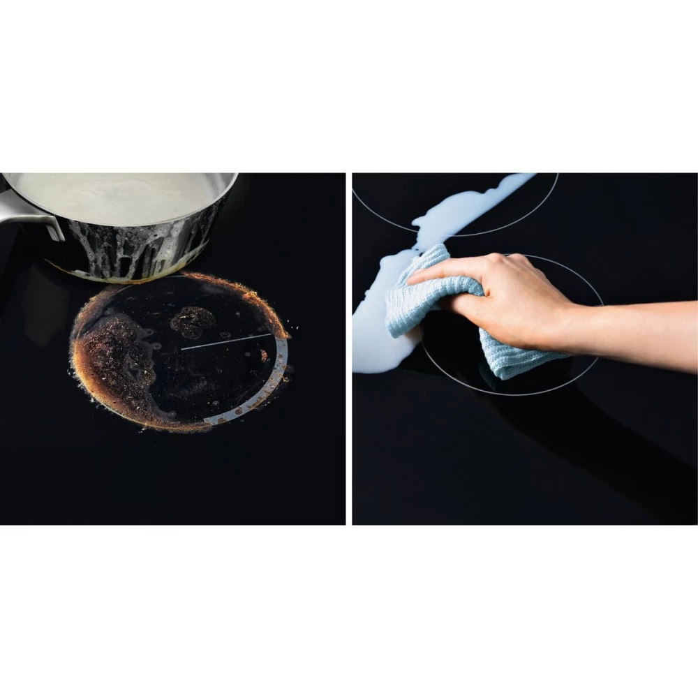 A főzőfelület főzés közben is tisztán tartható. Az indukciós technológiának köszönhetően a főzőzóna körüli terület mindvégig hűvös marad. Ha magas hőmérsékleten főz is, a kiömlött ételt gyorsan és biztonságosan, késedelem nélkül feltakaríthatja.