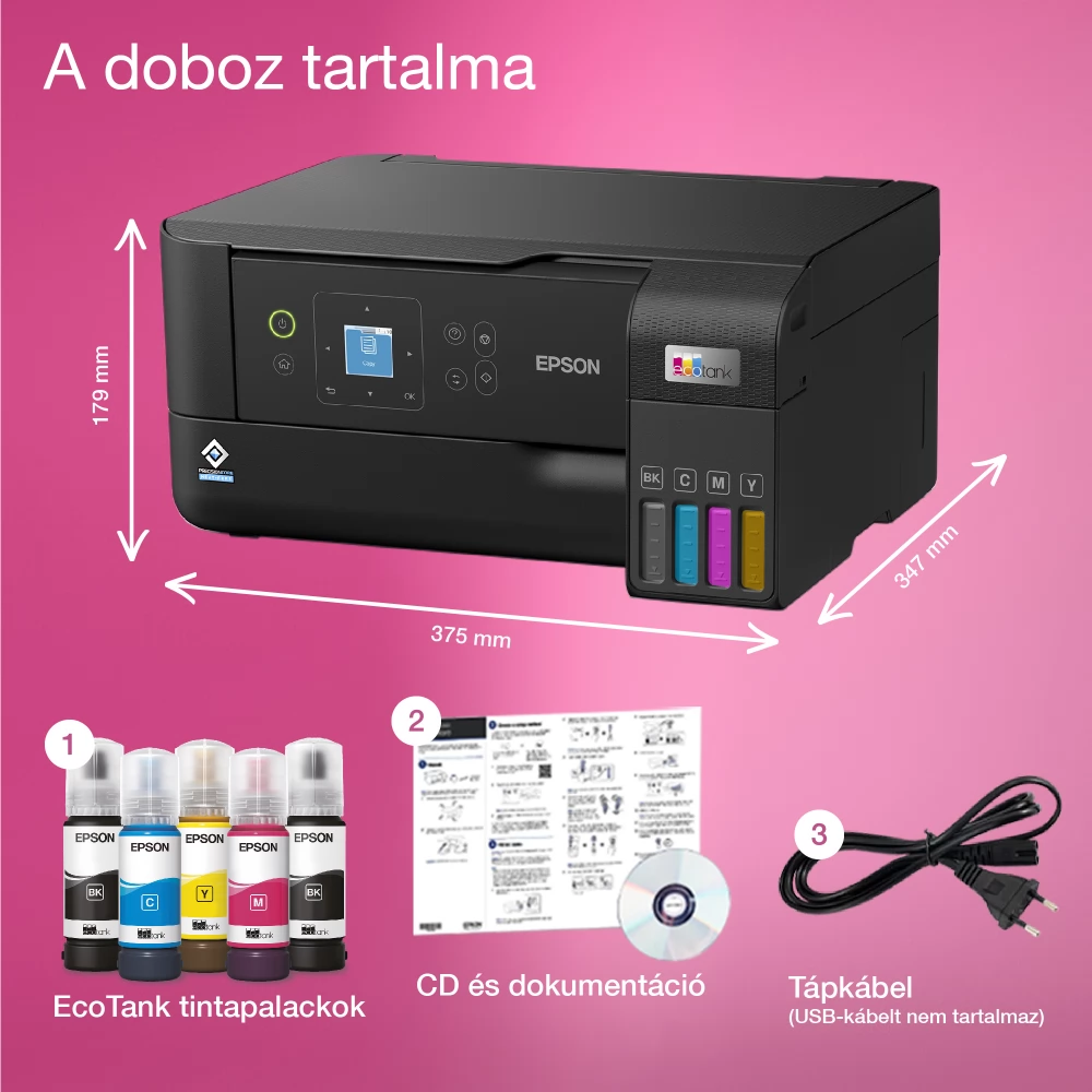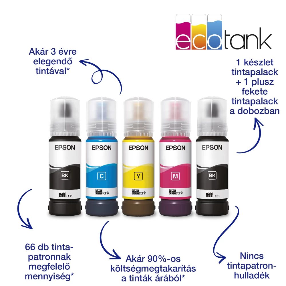 Takarítson meg akár 90%-ot a nyomtatás költségein¹ az Epson tintapatron nélküli EcoTank nyomtatóival. Az integrált tintatartályok – amelyekhez nagy kapacitású tintapalackokat mellékelünk – a speciálisan kialakított tintapalackoknak köszönhetően könnyedén feltölthetők. Mivel nem kell tintapatronokat cserélni, illetve a készülék rugalmas csatlakoztathatóságának és az LCD kijelzőnek köszönhetően ez a nyomtató tökéletes választás azok számára, akik kiváló minőségű nyomatokat szeretnének előállítani, hihetetlenül alacsony oldalankénti költség mellett.
