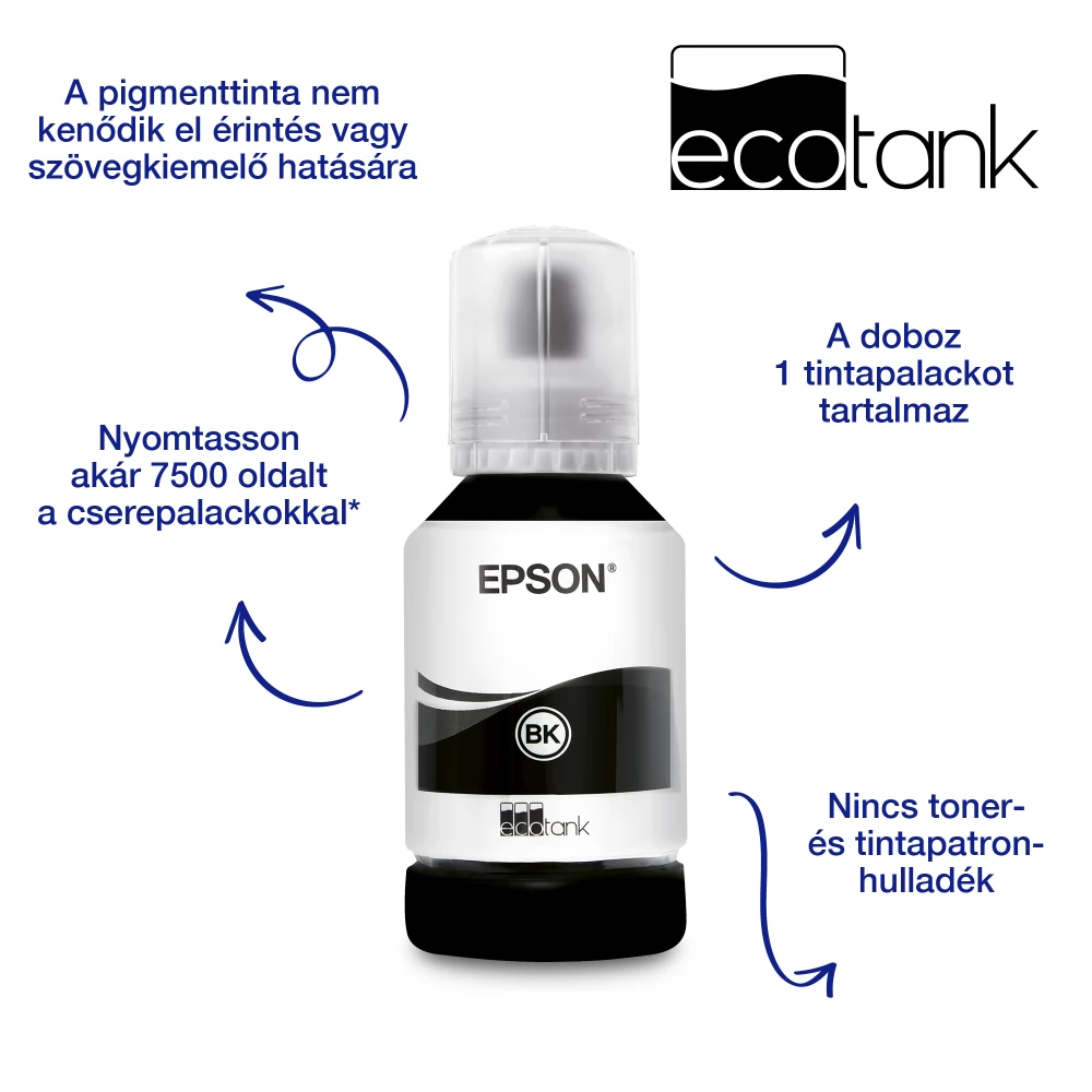 A gyorsan száradó pigmenttinta foltmentes nyomatokat eredményez, amelyek még a szövegkiemelő filceknek is ellenállnak. A megbízható és kiváló minőségű tinta használatával biztos lehet benne, hogy kiváló nyomatokat kap, tiszta szöveggel. Egyetlen csere tintapalack készlet akár 7500 fekete-fehér oldal nyomtatásához is elegendő.