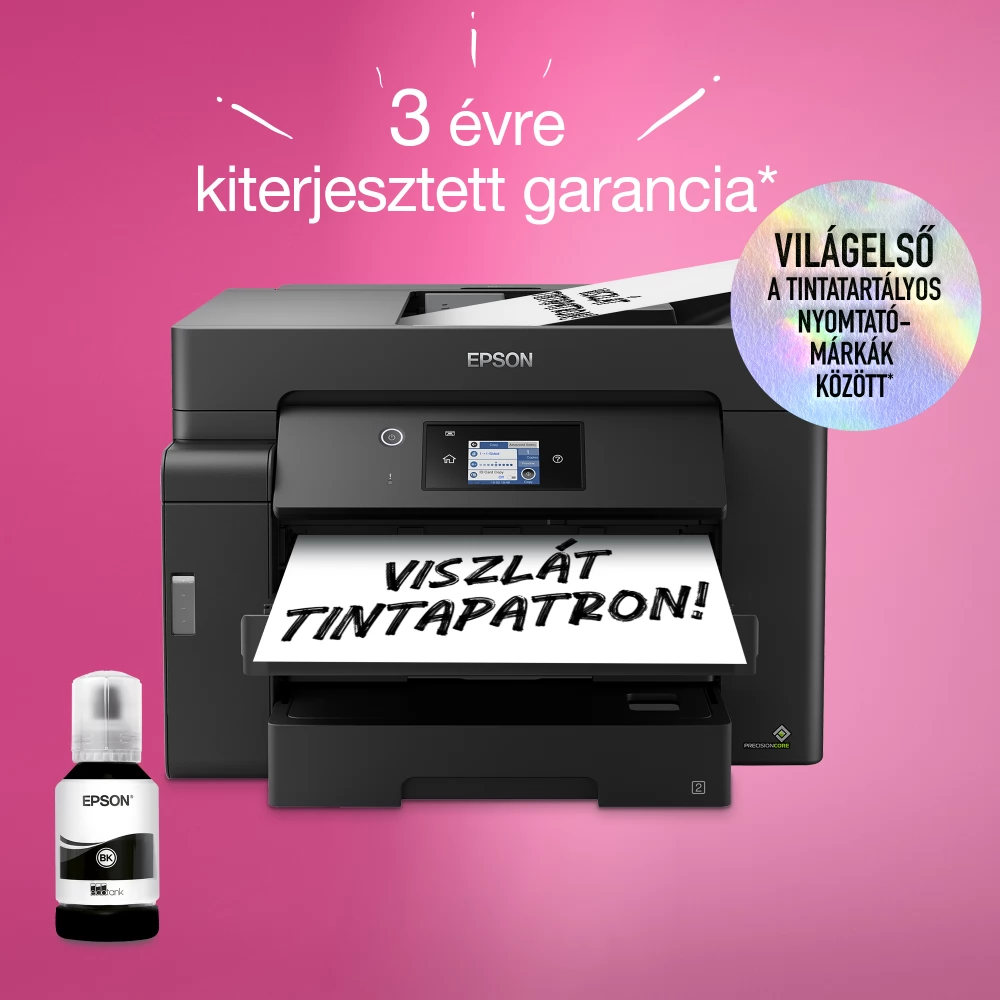 A tintatartályok feltöltése egyszerű a visszazárható, intuitív és cseppmentes tintapalackokkal. Az Epson egyedülálló hő nélküli PrecisionCore technológiája nagyobb megbízhatóságot, csökkentett állásidőt és alacsonyabb környezeti terhelést jelent. Nincs szükség bemelegedési időre, az első oldal pedig hamarabb elkészül, alacsonyabb áramfogyasztás mellett.