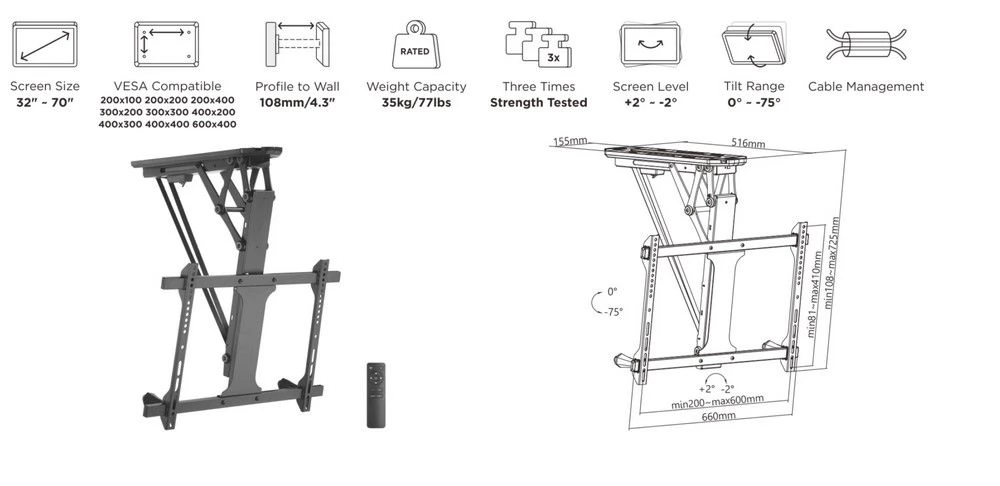 A kiváló minőségű motor egyetlen gombnyomással automatikus emelési funkciót biztosít. A kényelmes rádiófrekvenciás távirányító lehetővé teszi a falon keresztüli és a TV-től távoli vezérlést.