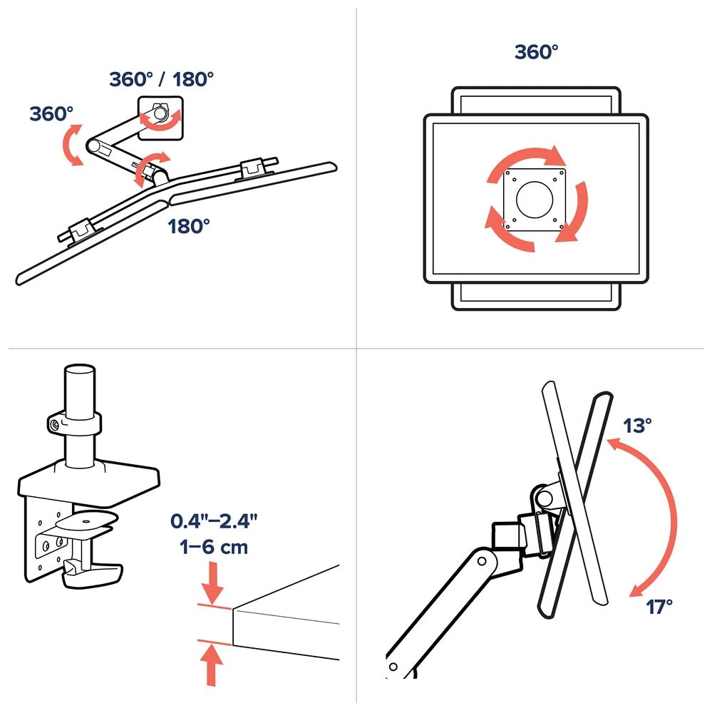 - Növelje a termelékenységet: Emelje meg, döntse meg és fordítsa el monitorait a tökéletes nézet érdekében, amely tökéletesíti a fókuszt