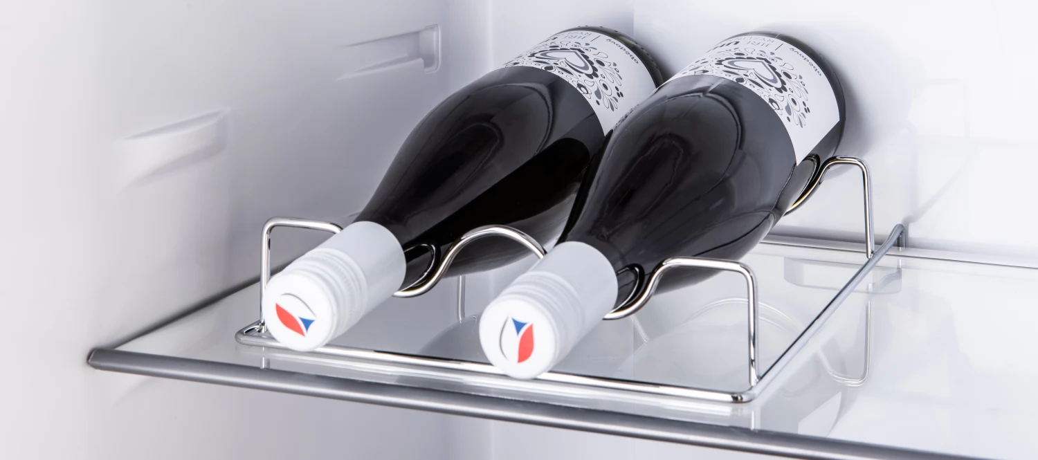 A hűtőtér 182 literes, 3 üvegpolccal és palacktartókkal rendelkezik. A hűtőajtóban további 3 átlátszó polc található, és az alsó részén egy gyümölcs- és zöldségtartó doboz is helyet kapott.