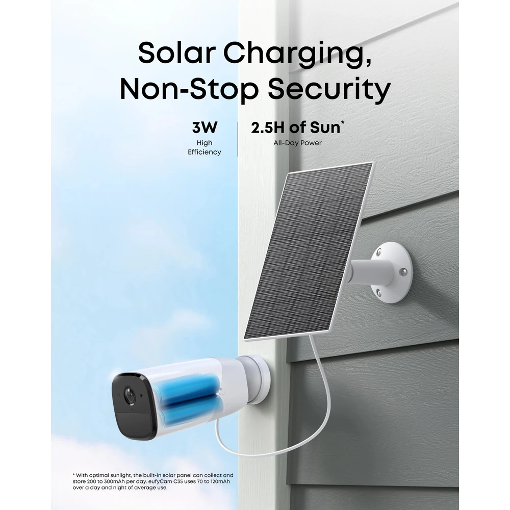 Mindössze 2,5 óra napfény biztosítja az eufyCam egész napos működését, így nem kell rendszeresen töltened.