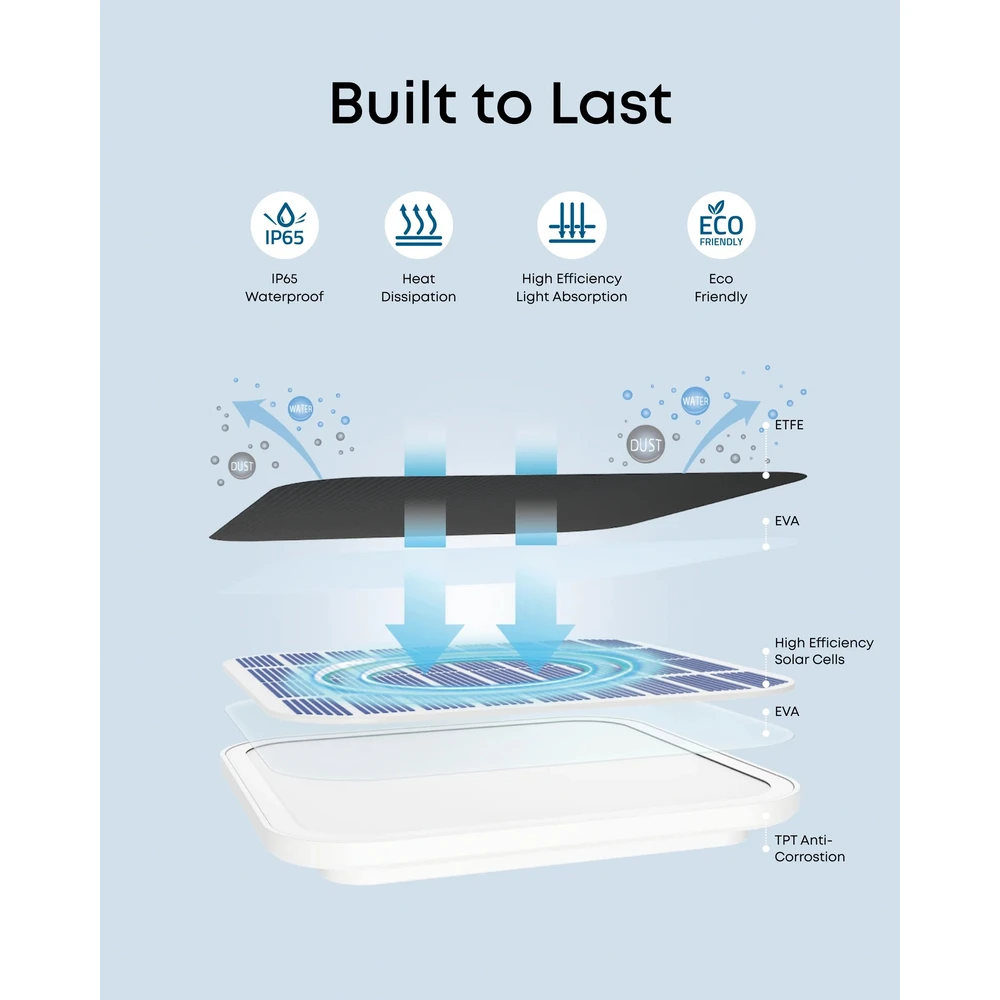 Tartalmaz egy 360°-ban állítható tartót egy 2 m-es (6,5 láb) töltőkábellel, így könnyen megtalálhatod a legjobb szöget a napfény bejutásához.
