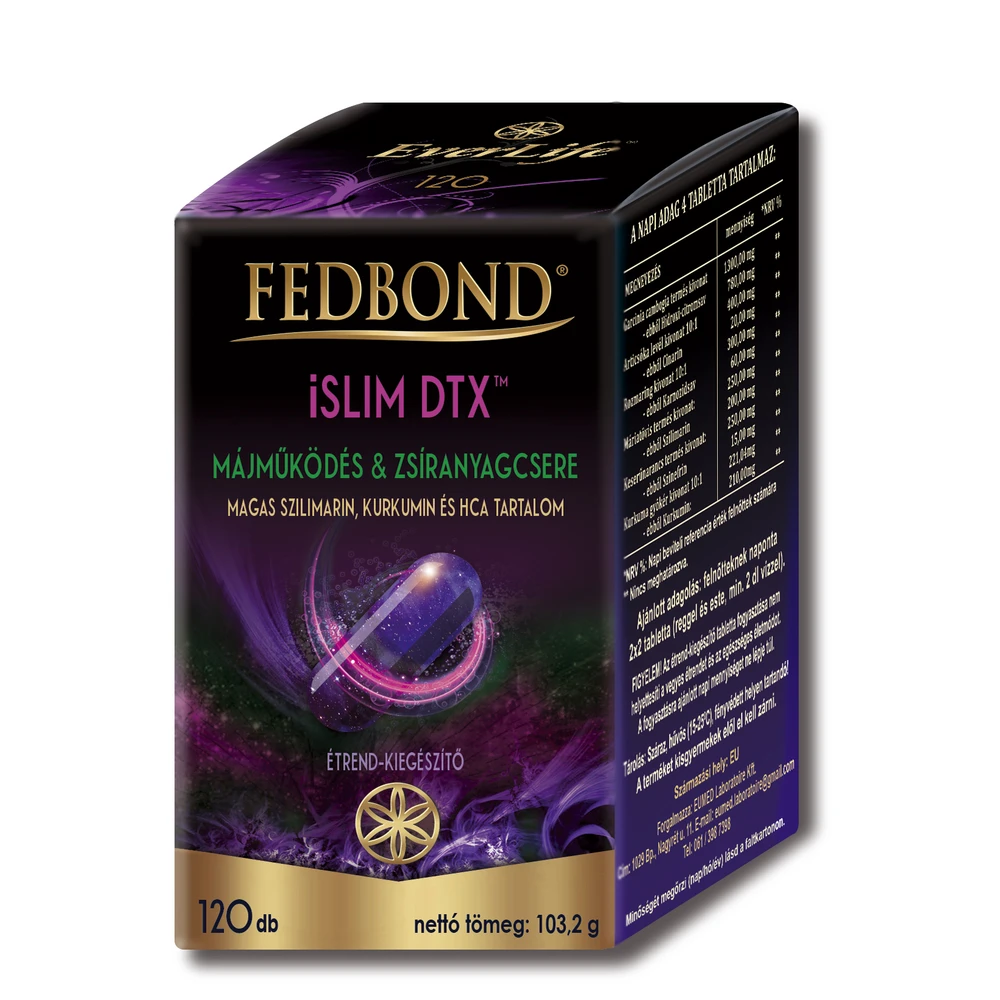 "A FEDBOND® iSLIM DTXTM magas szilimarin tartalommal, természetes módon, a test fiziológiai működéseit figyelembe véve éri el a máj méregtelenítő folyamatainak a támogatását, illetve a (zsírok feldarabolásáért...