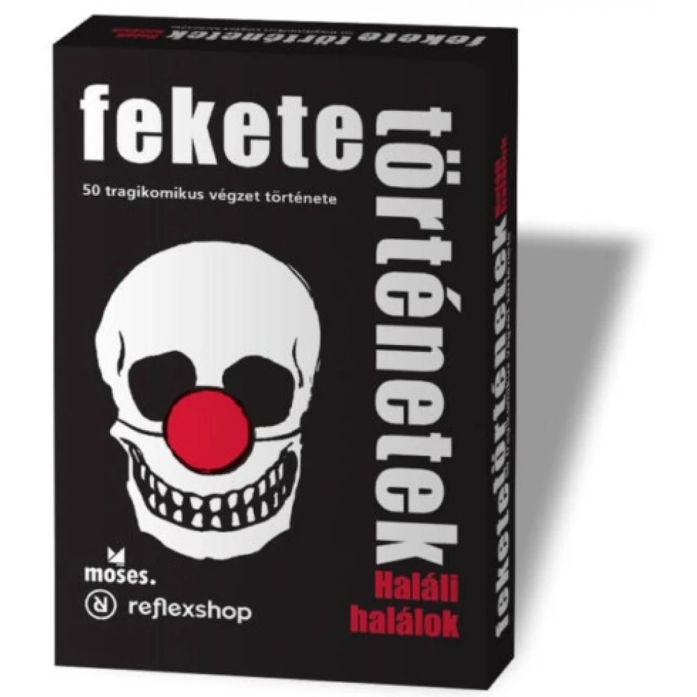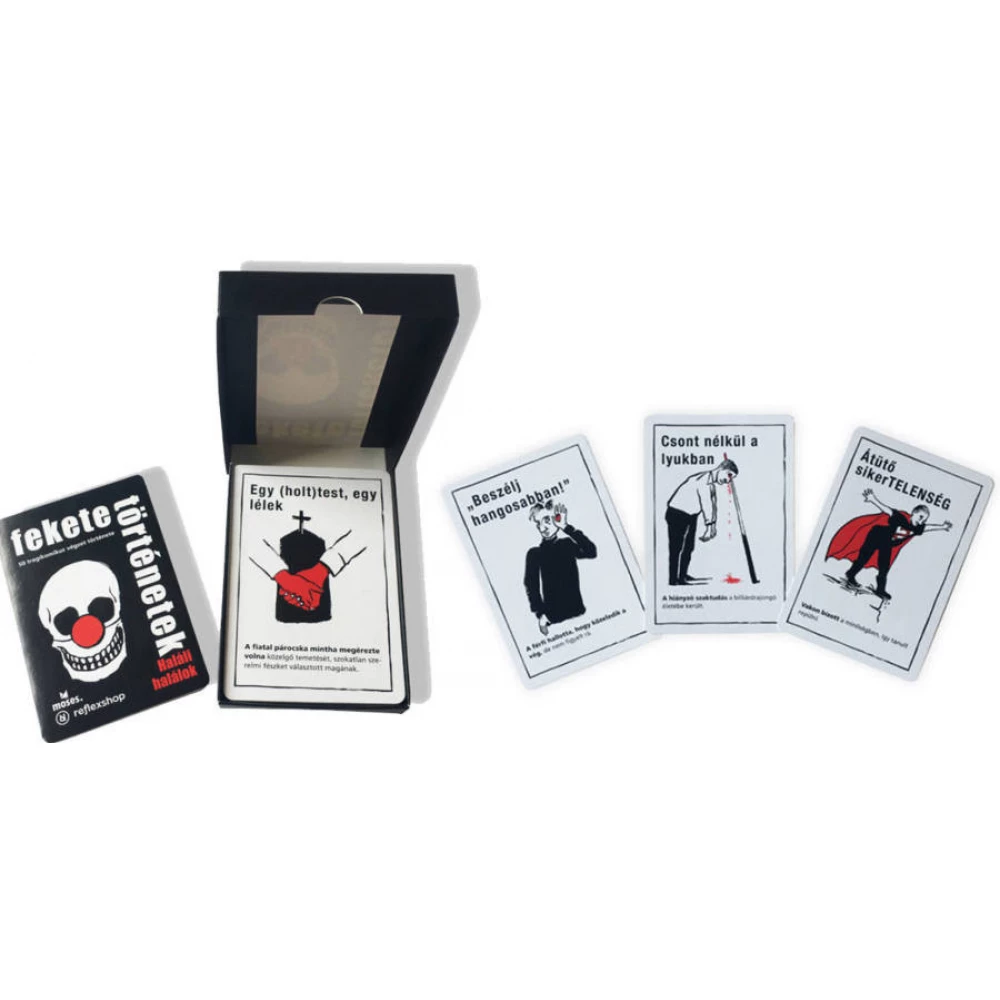 A Fekete történetek: Haláli halálok kiadásában 50 tragikomikus végzet 100%-osan igaz történetét találod. Szükség lesz egy mesélőre, aki felolvassa a többieknek a kártya elején látható talányos mondatot, a többiek pedig megpróbálják kitalálni, hogy mi is történhetett. A mesélő a kártya másik oldalán látja a teljes sztorit, és a többiek eldöntendő kérdéseire válaszolva próbálja őket elvezetni a véres igazsághoz.