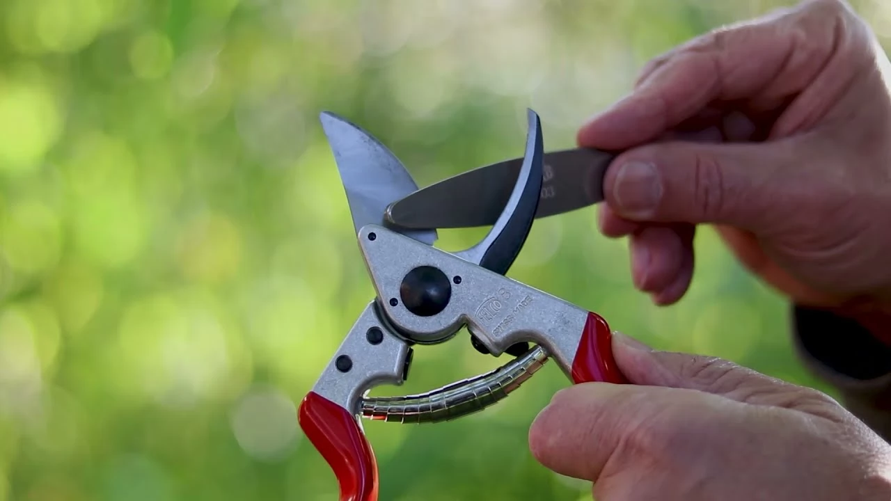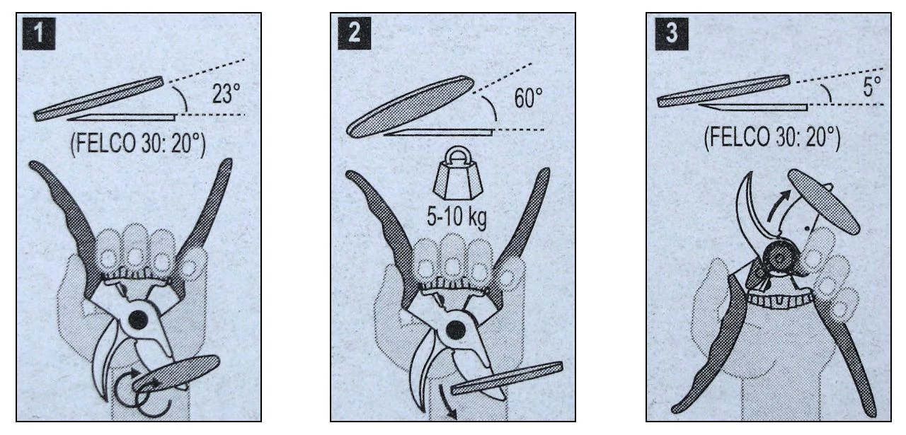 A FELCO 903 élező szerszám azért olyan karcsú (110 x 20 x 4 mm), hogy az ollók szétszedése nélkül is tudjunk dolgozni vele. A metszőollóknál kizárólag csak a vágópenge külső, domború vagy ferde oldalát szabad csiszolni, élezni, fenni. A kertészkéseknél ugyanez vonatkozik a ferde, a körömmélyedéses oldalra. A túlsó, sík vagy minimálisan homorú oldalon legfeljebb csak az élezés közben keletkezett sorját szabad, minél kevesebb mozdulattal, 5 fokos hajlásszögben lehúzni, eltávolítani.