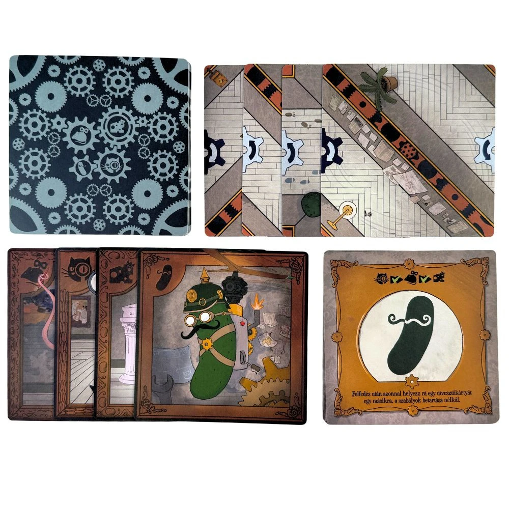 A játék egyszerre logikai, taktikai és teljesen abszurd élményt nyújt. 2–4 játékos számára ajánlott. A doboz tartalmaz 36 kártyát (útvesztő-, titkos terv-, valamint karakter kártyák) és 1 szabályfüzetet.
