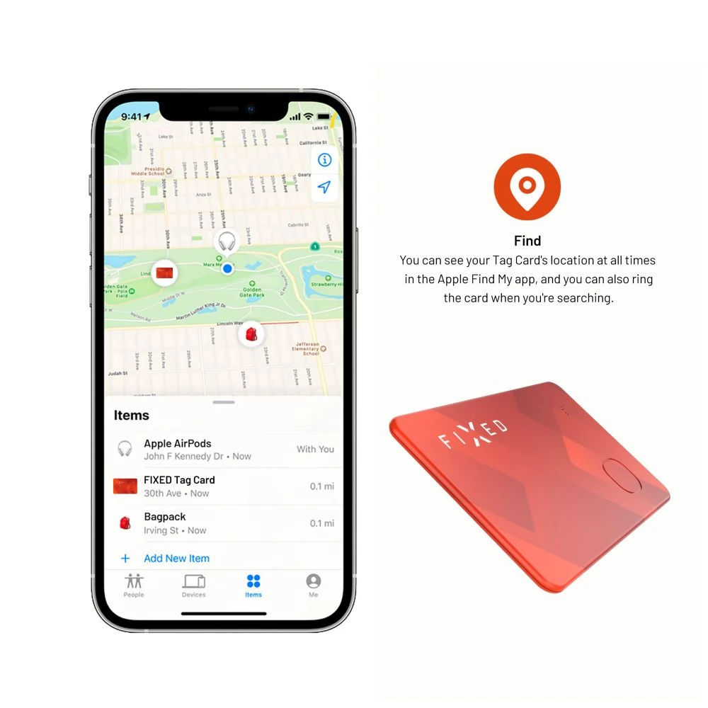 Az Apple Find My tanúsítványnak köszönhetően könnyedén párosíthatod a Tag Cardot iPhone-oddal vagy más iOS-eszközzel. A Find alkalmazásban ugyanolyan megbízhatóan működik, mint az AirTag vagy a többi Apple-eszköz. A Tag Card Bluetooth-jelen keresztül közli a helyét, majd a Find Me hálózatban lévő összes közeli eszköz továbbítja a helymeghatározó helyét az iCloudba, így az összes információt térképen is megtekintheti az alkalmazásban. A FIXED Tag Card mindig biztonságban és világszerte több millió Apple-felhasználó felügyelete alatt lesz. A felhasználói adatvédelem titkosítással védett, a Tag Card helymeghatározási adatai anonimak.