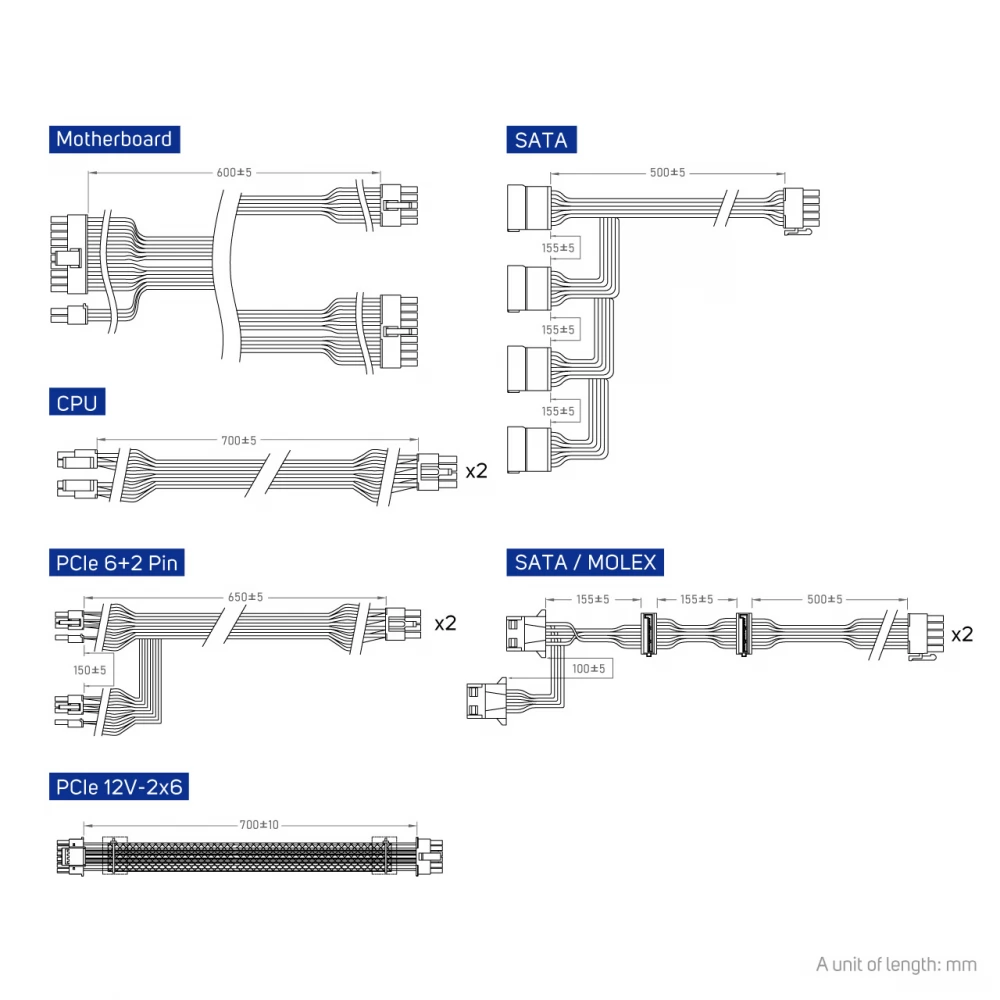 A kettős PCIe 6+2 tűs kábel és egy sokoldalú 12V-2x6 kábel rugalmas konfigurációt kínál még a legáraméhesebb NVIDIA vagy AMD grafikus kártyák számára is.