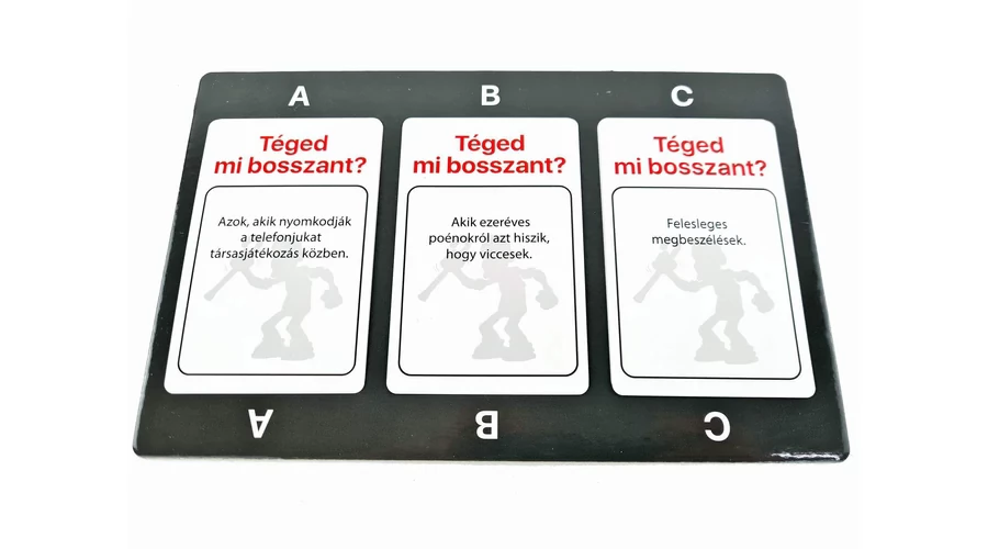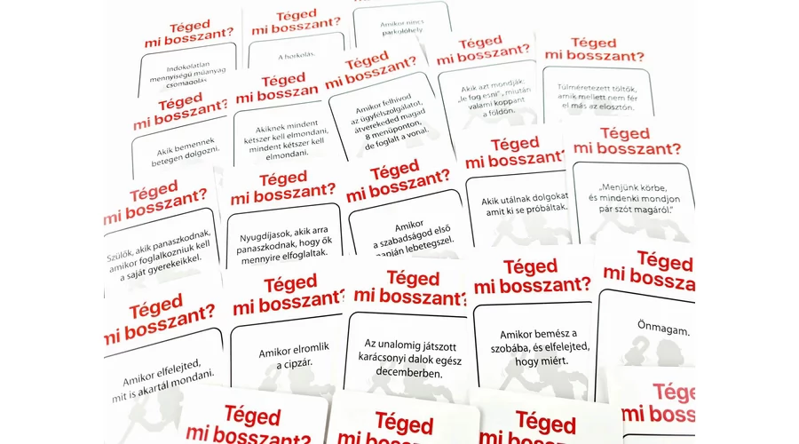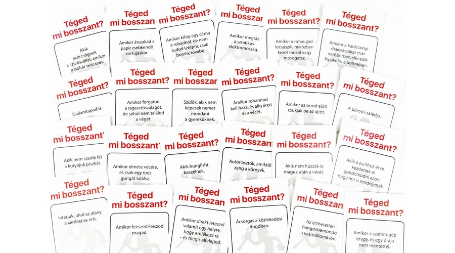 Téged mi bosszant fel legjobban: egy szőnyegre hullott hajszál, egy beragadt kerekű bevásárló kocsi, vagy a hejesírási hibák? Hogyan reagálsz ezekre a mindennapi feszültségekre, és vajon a többiek ugyanezeket a dolgokat találják majd irritálónak mint te? Minél jobban eltalálod, mi zavarja a többieket, annál közelebb kerülsz a győzelemhez!