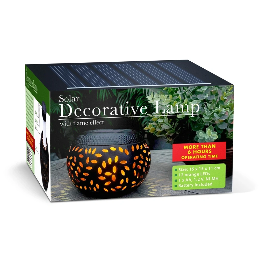 Ez a hangulatos, gömb formájú kültéri dekor lámpa valósághű lángeffektussal teremt meleg, romantikus fényt a teraszon vagy a kertben. A 12 darab narancssárga, „táncoló" SMD LED izzó hitelesen imitálja a láng lobogását, látványos fény-árnyék mintázatot vetve a fém külső héjon keresztül a környezetére.\n\nA beépített 2V/30 mA-es napelem napközben feltölti a 300 mAh kapacitású Ni-MH akkumulátort, így a lámpa akár 6–8 órán át is üzemel sötétedés után, teljesen energiatakarékos módon. Az automatikus ki- és bekapcsoló funkciónak köszönhetően nincs szükség kézi beavatkozásra, az ON/OFF kapcsoló a lámpa tetején is megtalálható.\n\nAz IP44 védettségi fokozatnak megfelelő fém burkolat ellenáll az időjárás viszontagságainak. A 360 fokos fényhatás révén minden irányból élvezhető a különleges hangulat. Méretei: Ø15 × 11 cm, tömege mindössze ~300 g.