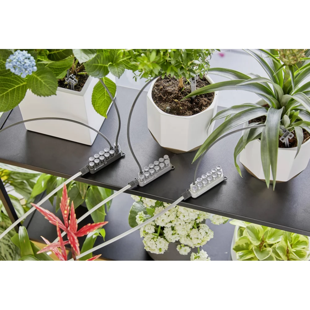 Akár nyaralsz, akár üzleti úton vagy, vagy csak túlságosan elfoglalt vagy otthon - a GARDENA Automata öntözőkanna készlettel többé nem kell aggódnod szobanövényei öntözése miatt. A távolléted ellenére a növények továbbra is optimális öntözésben részesülnek. Az öntözőrendszer áramforrást igényel, de csapcsatlakozást nem. Az Automata öntözőkanna készletet bárhol elhelyezheted otthonodban egy konnektor közelében. A három különböző vízmennyiség leadására képes cseppelosztóknak köszönhetően akár 36 különböző szobanövényt - a vízigénytől függően - egyszerre, naponta egy percig öntözhetünk, figyelembe véve a különböző vízszükségleteket. Az Automata öntözőkanna készlet tartalmazza az összes szükséges egyedi alkatrészt, és azonnal használható. A rendszert könnyű telepíteni és működésbe hozni. A hozzá tartozó víztartály 80 százalékban újrahasznosított anyagból áll, ezért fenntartható öntözési megoldás az otthonod vagy télikerted számára. Még az öntözőszivattyúhoz is csatlakoztatható az optimális vízfelhasználás érdekében. A tartály praktikus tárolási lehetőség a készlet egyes alkatrészei számára. Keskeny kialakításának köszönhetően az öntözőkészlet észrevétlenül elhelyezhető otthonodban, és elrejthető a bútorok mögé. A rendszer okos, modern kialakítása időtállóvá teszi az öntözőkészletet, amely tökéletesen illik bármely lakótérbe. Természetesen az erkélyen is használhatod a készletet. Az akár 10,5 liter vízzel is feltölthető víztartály megbízható vízellátást biztosít. Az sem jelent problémát, ha hosszabb időre elutazol: a csatlakozási lehetőségnek köszönhetően a vízmennyiség növelhető további víztartályok csatlakoztatásával. Távolléti növénygondozás. Független öntözés szobanövények számára.