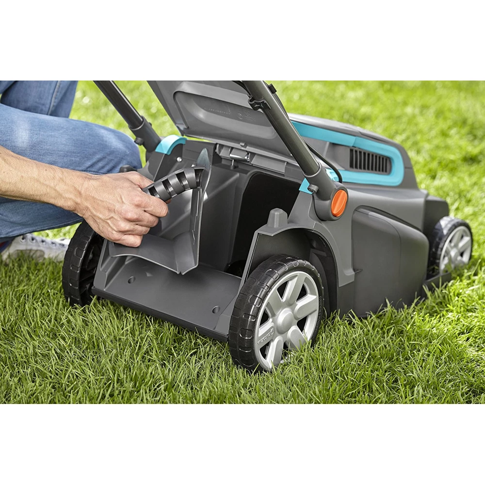 Az erőteljes, elektromos GARDENA PowerMax™ 1800/42 fűnyíró tökéletes nagy gyepterületek gondozásához. A speciálisan megedzett DuraEdge kés optimális vágási eredményt nyújt. Az ErgoTec Plus markolat fogása kényelmes; különösen könnyen és rugalmasan tolható a fűnyíró. A QuickFit Plus funkció használatával könnyen, központilag beállítható 5 féle vágási magasság. A burkolat oldalán elhelyezett terelőfogakkal egyszerű a fűvágás a falak és a szegélyek mentén. A CnC Plus rendszernek köszönhetően hatékony mind a vágás, mind a gyűjtés, valamint ritkábban kell a gyűjtőt kiüríteni. A teleszkópos és összehajtható tolókar a felhasználó testmagasságához állítható, szállítása egyszerű, tárolása helytakarékos.