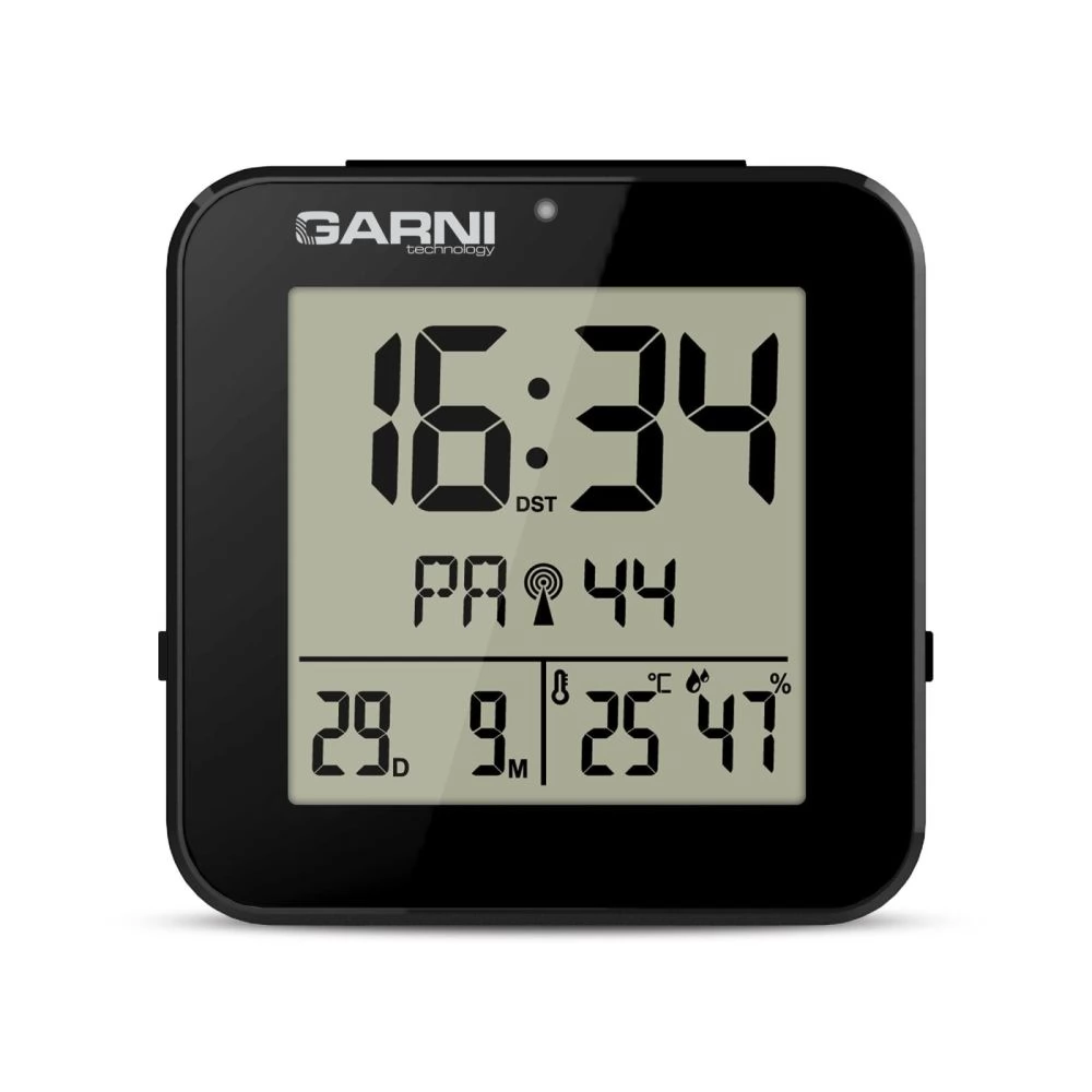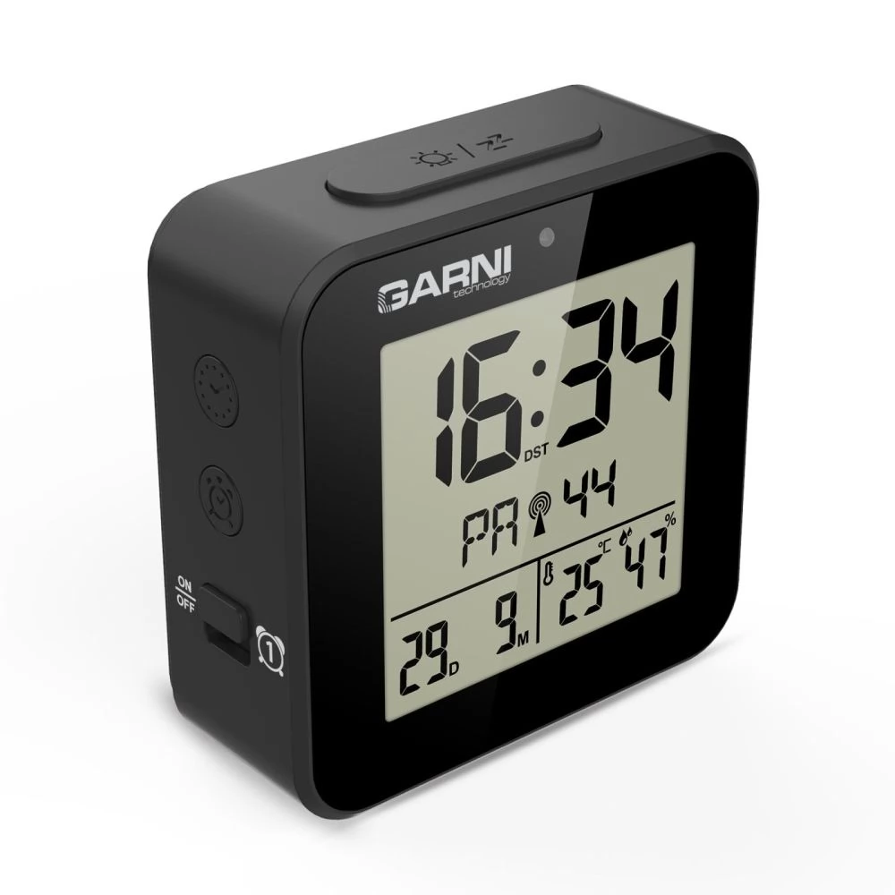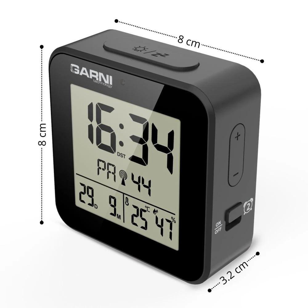 A GARNI 138B egy modern, kompakt digitális ébresztőóra, amely nemcsak pontos időt mutat, hanem beépített hőmérővel és higrométerrel is rendelkezik. Automatikus éjszakai világítása gondoskodik a kényelmes olvashatóságról sötétben is, míg az időt a DCF-77 rádiójel automatikusan szinkronizálja a maximális pontosság érdekében. A 8 másodpercig világoskék háttérvilágítással rendelkező LCD kijelzőn jól láthatóan jelenik meg az idő, a dátum, a hőmérséklet, a páratartalom és az ébresztési idő.